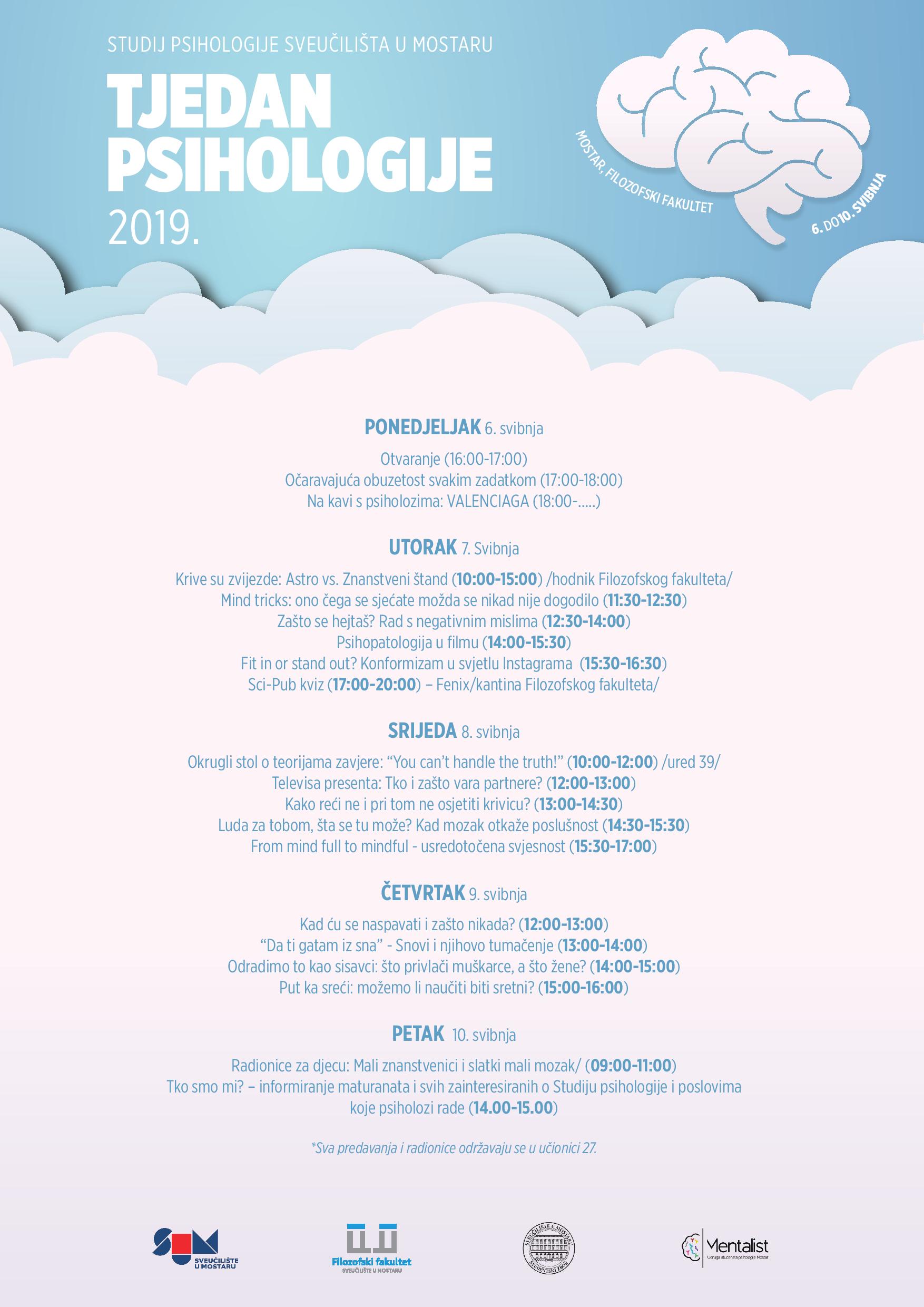 I ove su godine studenti iz Udruge studenata psihologije „Mentalist“ u suradnji sa Studijem psihologije Filozofskoga fakulteta Sveučilišta u Mostaru te uz podršku Filozofskoga fakulteta i Studentskoga zbora SUM-a organizirali niz praktičnih radionica i interaktivnih predavanja kojima je cilj ponuditi savjete i vještine za poboljšanje kvalitete života, popularizirati psihologiju i pri tome se dobro zabaviti.