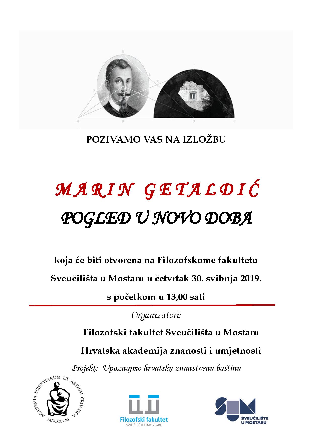Izložba pod nazivom Marin Getaldić – pogled u novo doba bit će otvorena na Filozofskome fakultetu Sveučilišta u Mostaru  u četvrtak 30. svibnja u 13 sati.