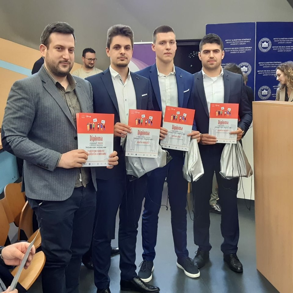 Studenti Politologije osvojili su drugo mjesto u natjecanju u debatama „Pričajmo o Europi. Pričajmo o nama!“ koja je održana u Sarajevu u organizaciji EU info centra. Naglasak natjecanja stavljen je na mlade ljude i studente, a teme o kojima se debatiralo bile su vezane za Europsku uniju i za Bosnu i Hercegovinu.