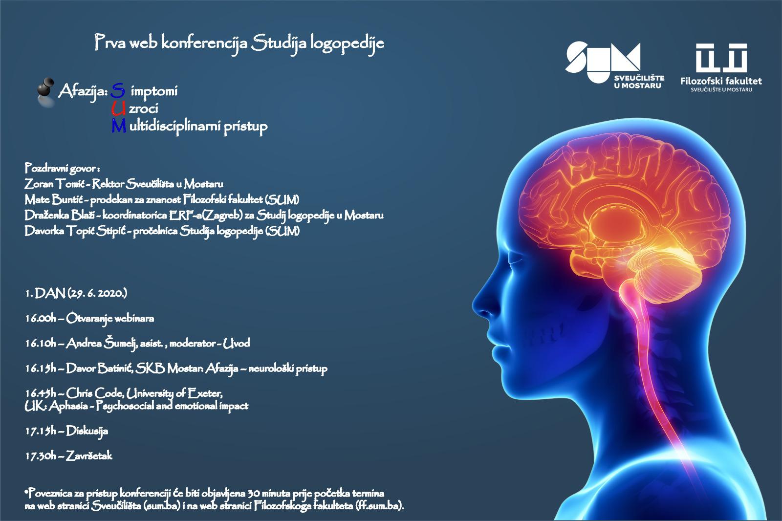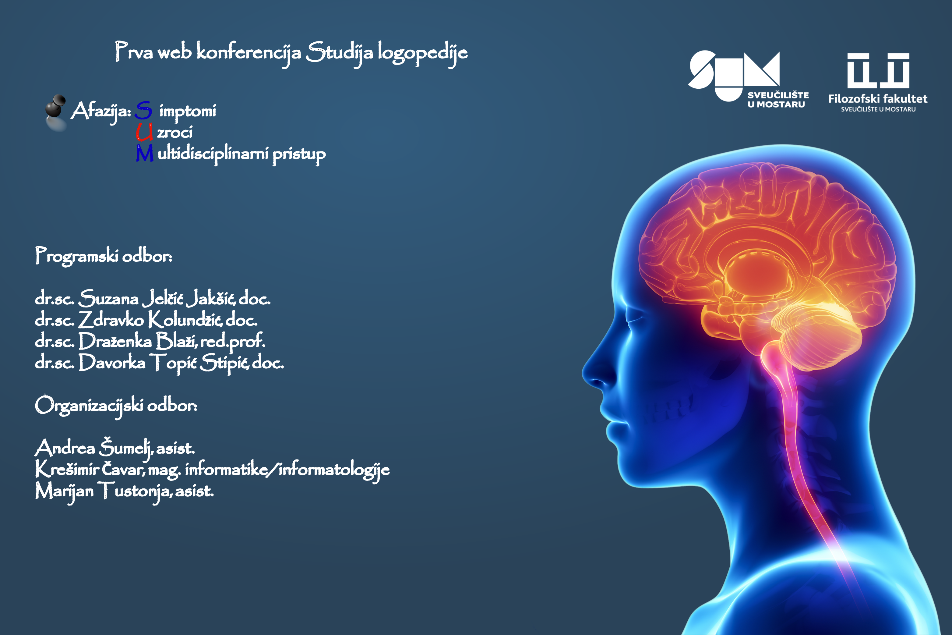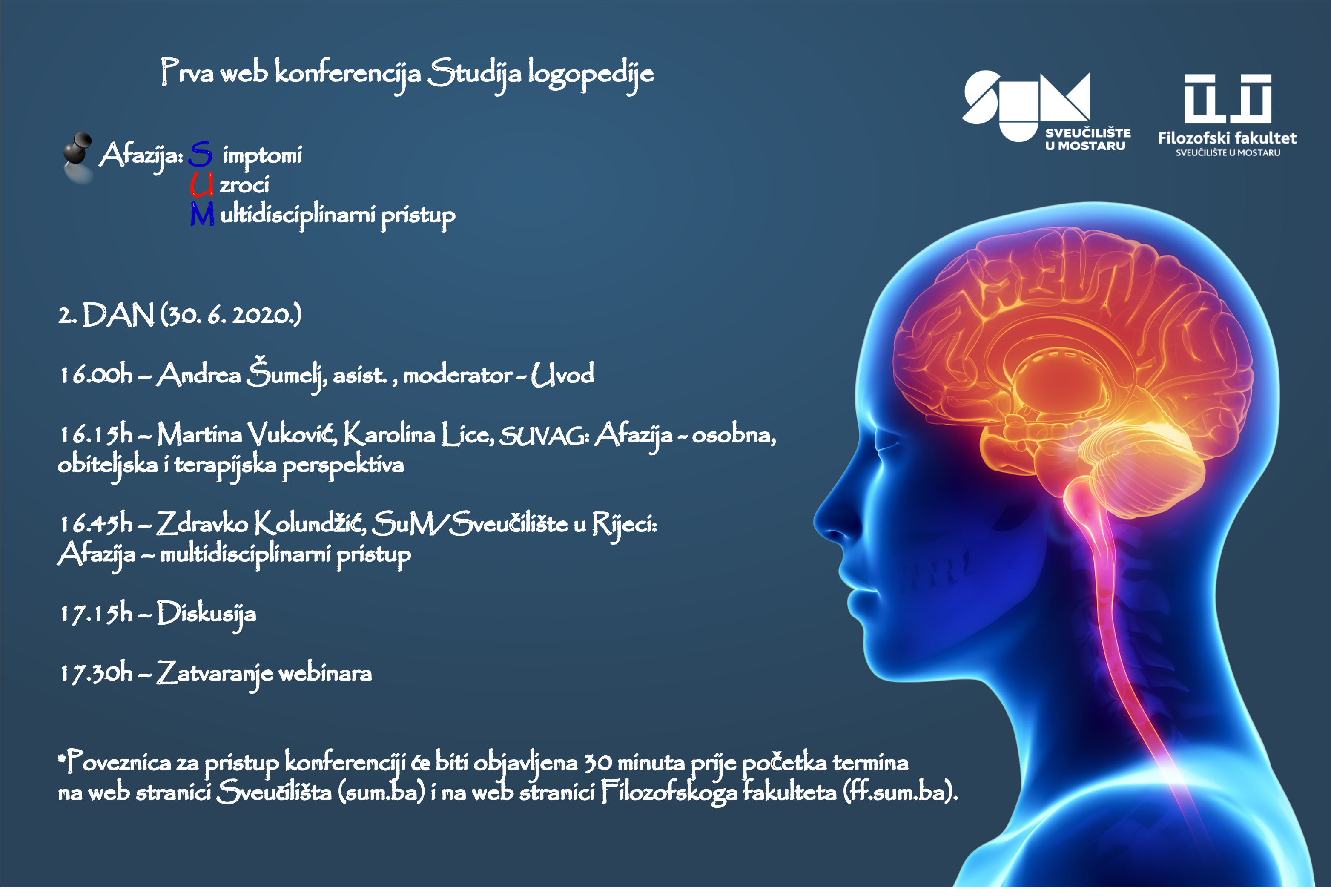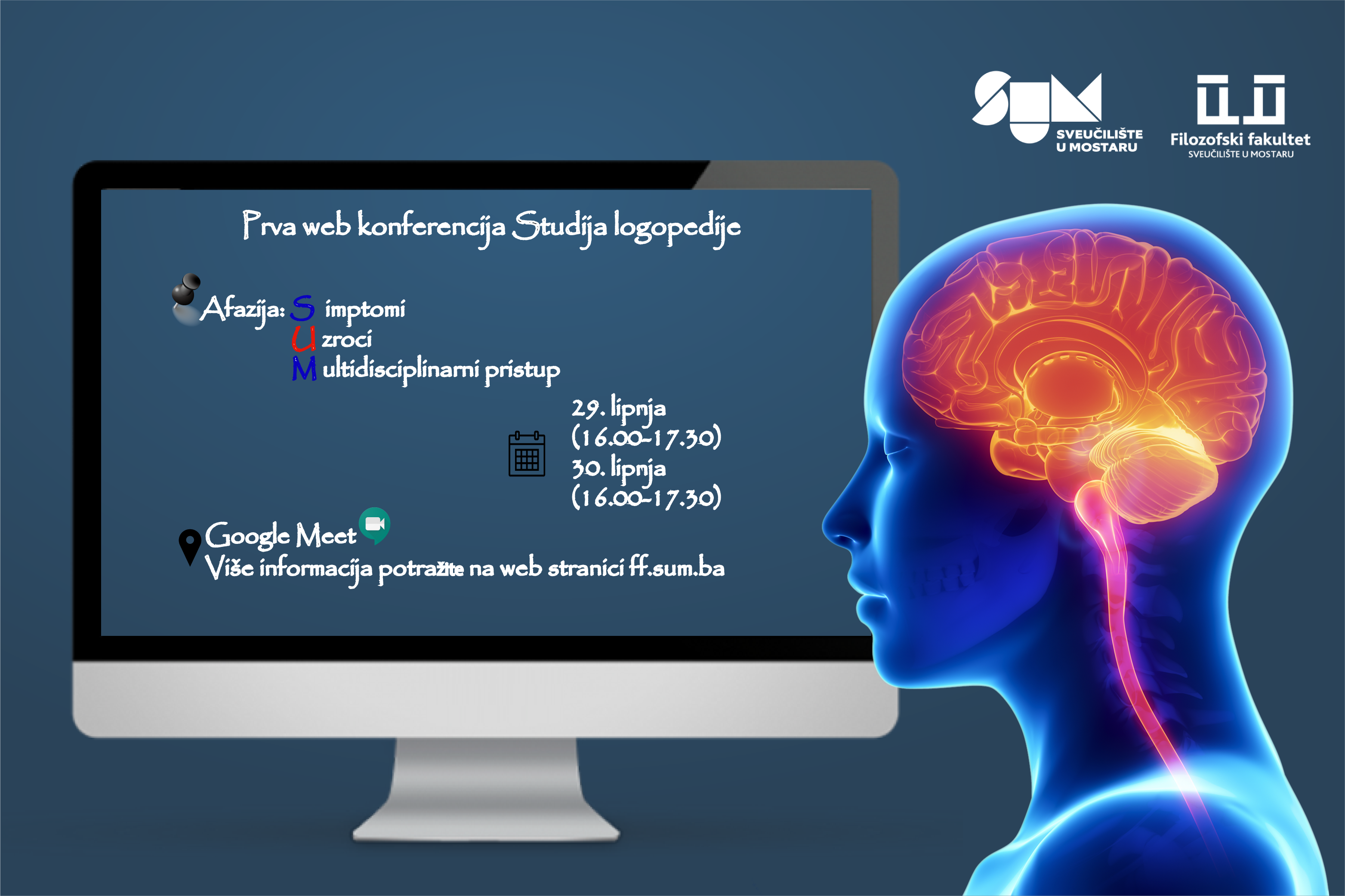 U organizaciji Studija logopedije, Filozofskoga fakulteta i Sveučilišta u Mostaru održat će se prva web-konferencija pod nazivom Afazija: Simptomi, Uzroci i Multidisciplinarni pristup 29. i 30. lipnja 2020. godine u 16 sati.