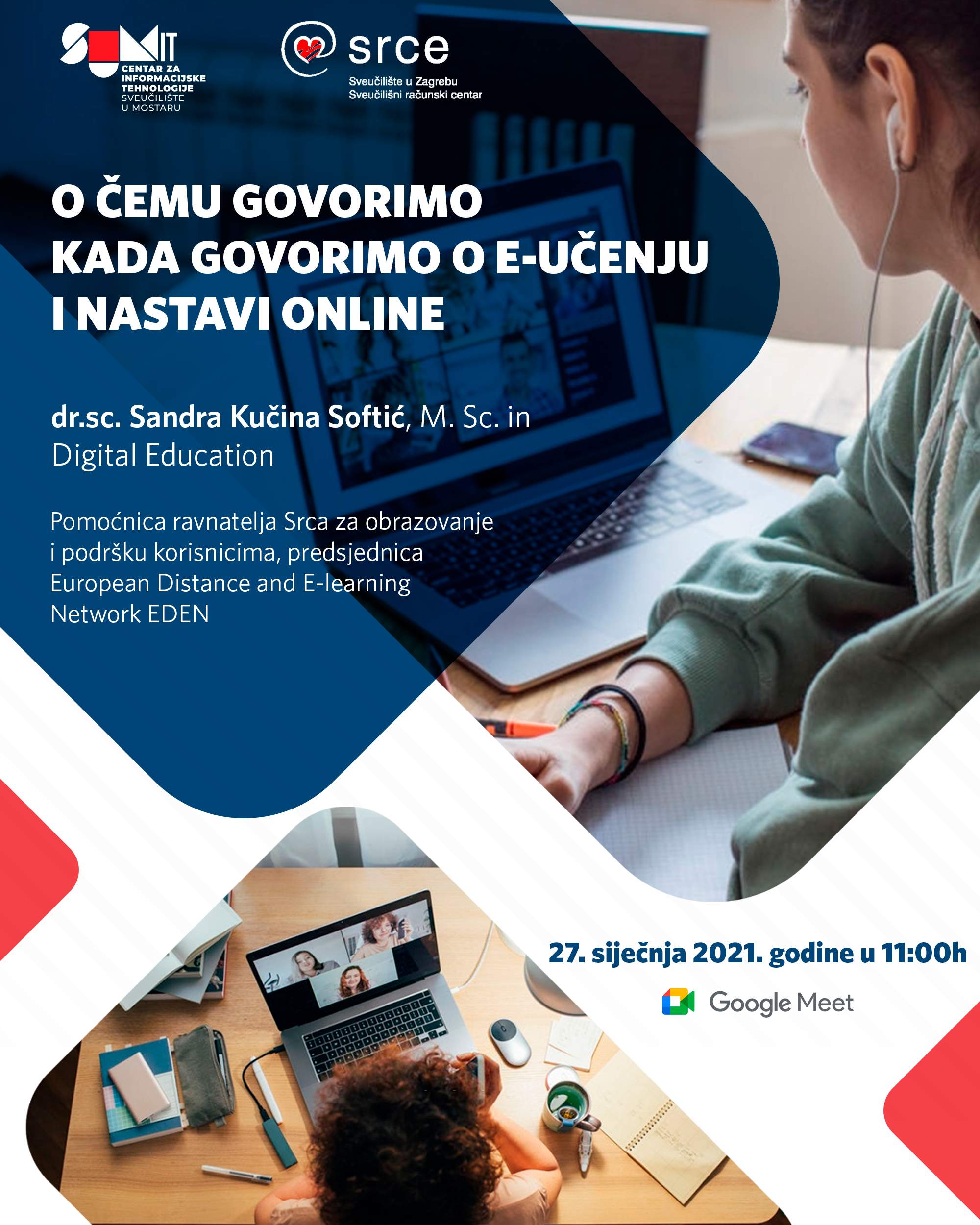 Predavanje „O čemu govorimo kada govorimo o e-učenju i nastavi online“ prilagođeno za nastavno osoblje održat će se 27. siječnja u 11 sati putem aplikacije Google Meet. Predavanje će održati dr.sc. Sandra Kučina Softić, M. Sc. in Digital Education, pomoćnica ravnatelja Srca za obrazovanje i podršku korisnicima, predsjednica European Distance and E-learning Network EDEN.