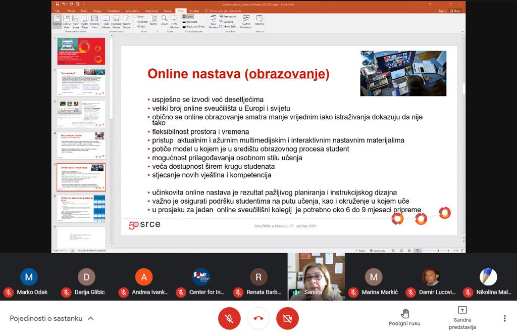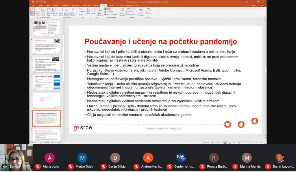 Dr. sc. Sandra Kučina Softić, mr. sc. digitalne edukacije, pomoćnica ravnatelja Srca za obrazovanje i podršku korisnicima, predsjednica obrazovnoga udruženja European Distance and E-learning Network (EDEN), održala je predavanje O čemu govorimo kada govorimo o e-učenju i nastavi online preko platformi Google Meet i YouTube Stream