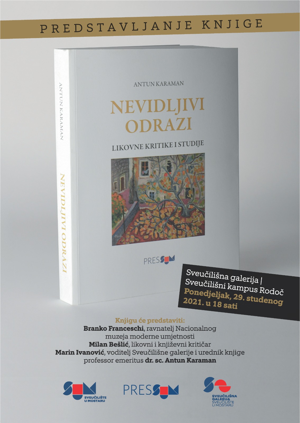 Studij povijesti umjetnosti Filozofskoga fakulteta Sveučilišta u Mostaru organizira predstavljanje knjige professora emeritusa dr. sc. Antuna Karamana "Nevidljivi odrazi - likovne kritike i studije" u ponedjeljak, 29. studenog 2021. u 18 sati u Sveučilišnoj galeriji u Rodoču. Prva je to knjiga iz nove sveučilišne edicije posvećene području umjetnosti, Biblioteke Ars et artifex.