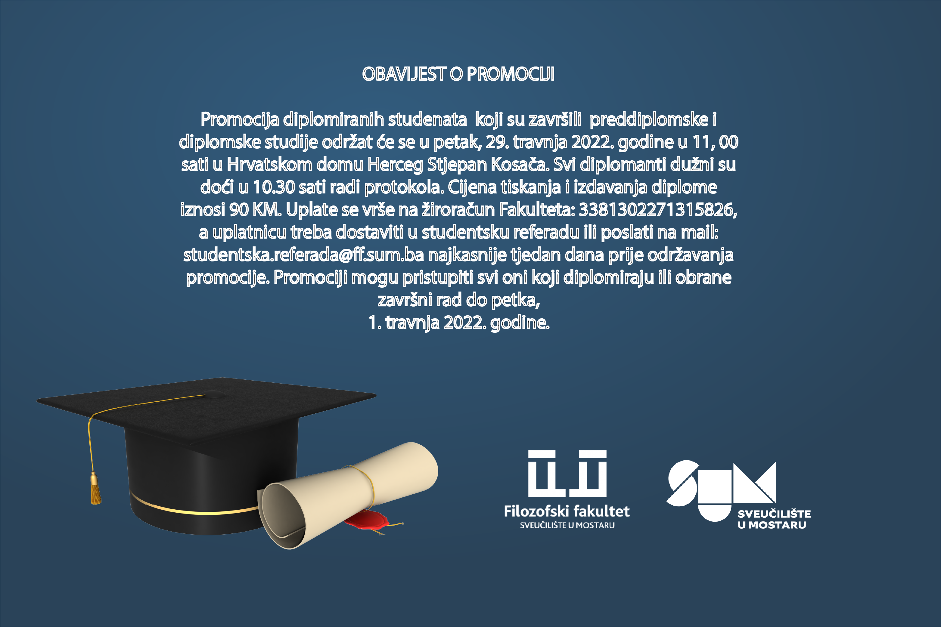 Promocija diplomiranih studenata  koji su završili  preddiplomske i diplomske studije održat će se u petak, 29. travnja 2022. godine u 11, 00 sati u Hrvatskom domu Herceg Stjepan Kosača. Svi diplomanti dužni su doći u 10.30 sati radi protokola. Cijena tiskanja i izdavanja diplome iznosi 90 KM. Uplate se vrše na žiroračun Fakulteta: 3381302271315826, a uplatnicu treba dostaviti u studentsku referadu ili poslati na mail: studentska.referada@ff.sum.ba najkasnije tjedan dana prije održavanja promocije. Promociji mogu pristupiti svi oni koji diplomiraju ili obrane završni rad do petka, 1. travnja 2022. godine.
