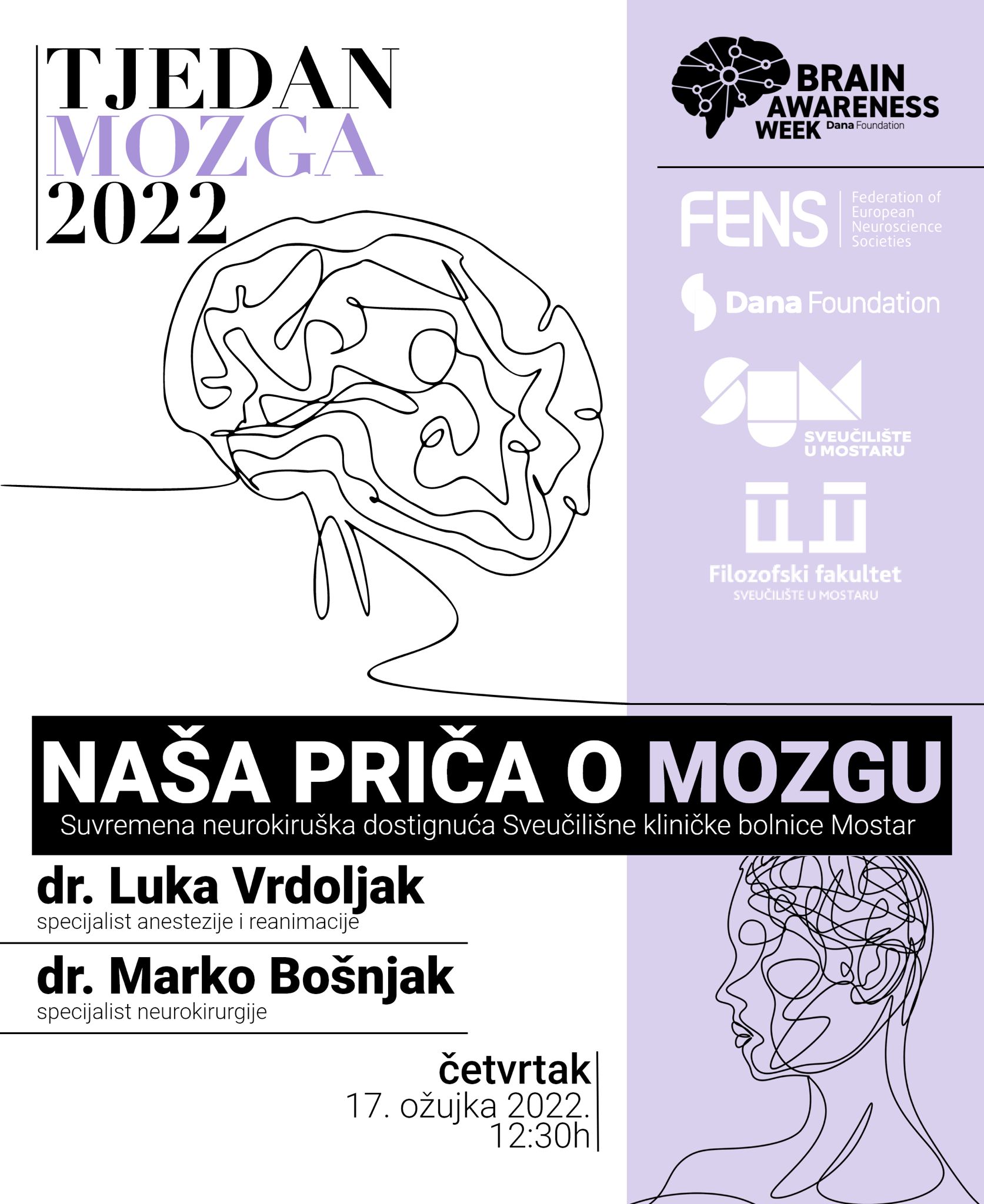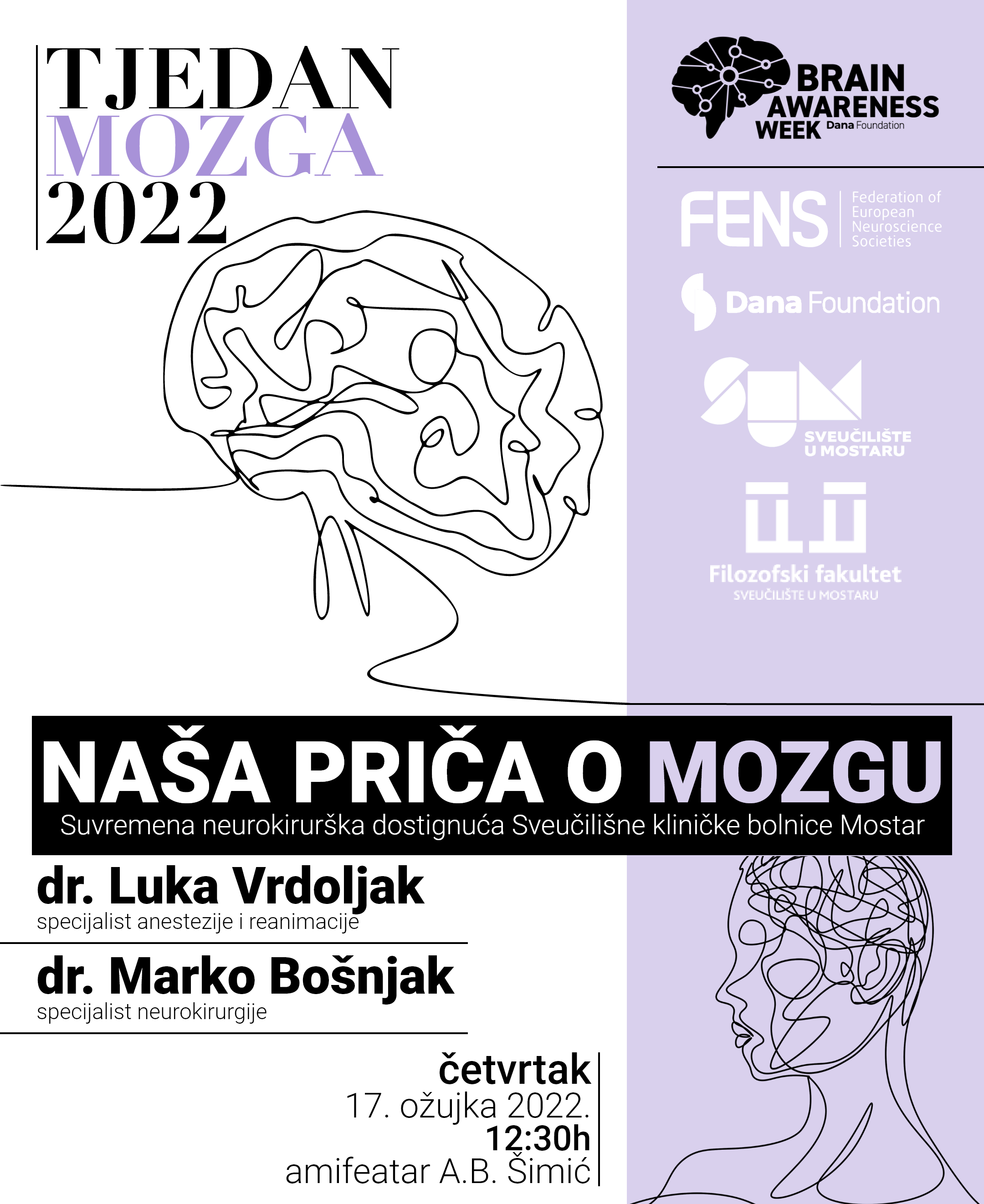 “Tjedan mozga” biti će obilježen i na Filozofskom fakultetu Sveučilišta u Mostaru predavanjem dr. Luke Vrdoljaka i dr. Marka Bošnjaka predavanjem na temu Naša priča o mozgu, te projekcijom videozapisa “Corpus callosum”. Svi entuzijasti i ljubitelji neuroznanosti, pozvani na šačicu razgovora i zanimljive trivije – o mozgu.