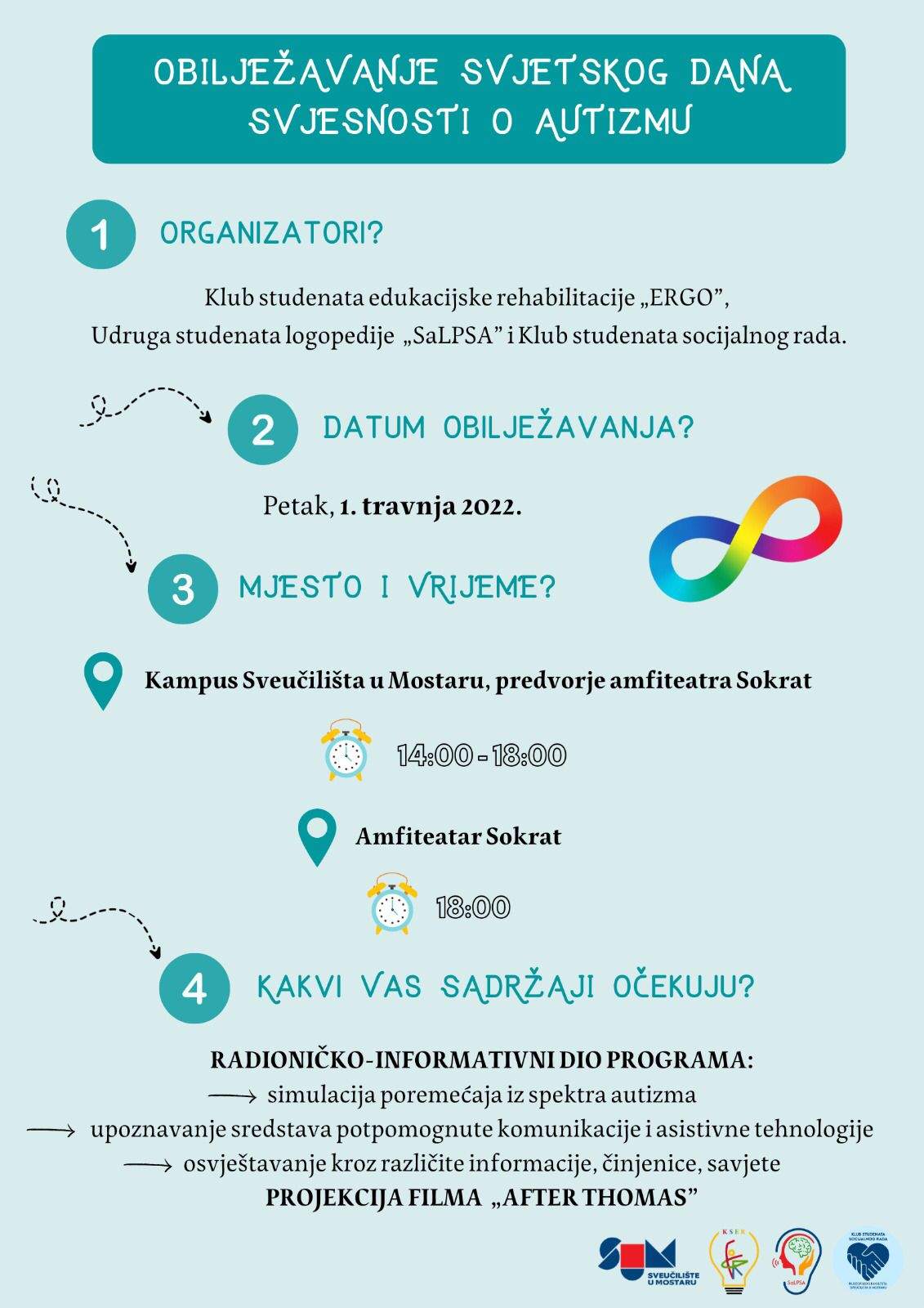 Udruga studenata logopedije Salpsa, Klub studenata edukacijske-rehabilitacije te Klub studenata socijalnog rada Sveučilišta u Mostaru u petak, 1. travnja obilježit će Svjetski dan svjesnosti o autizmu.