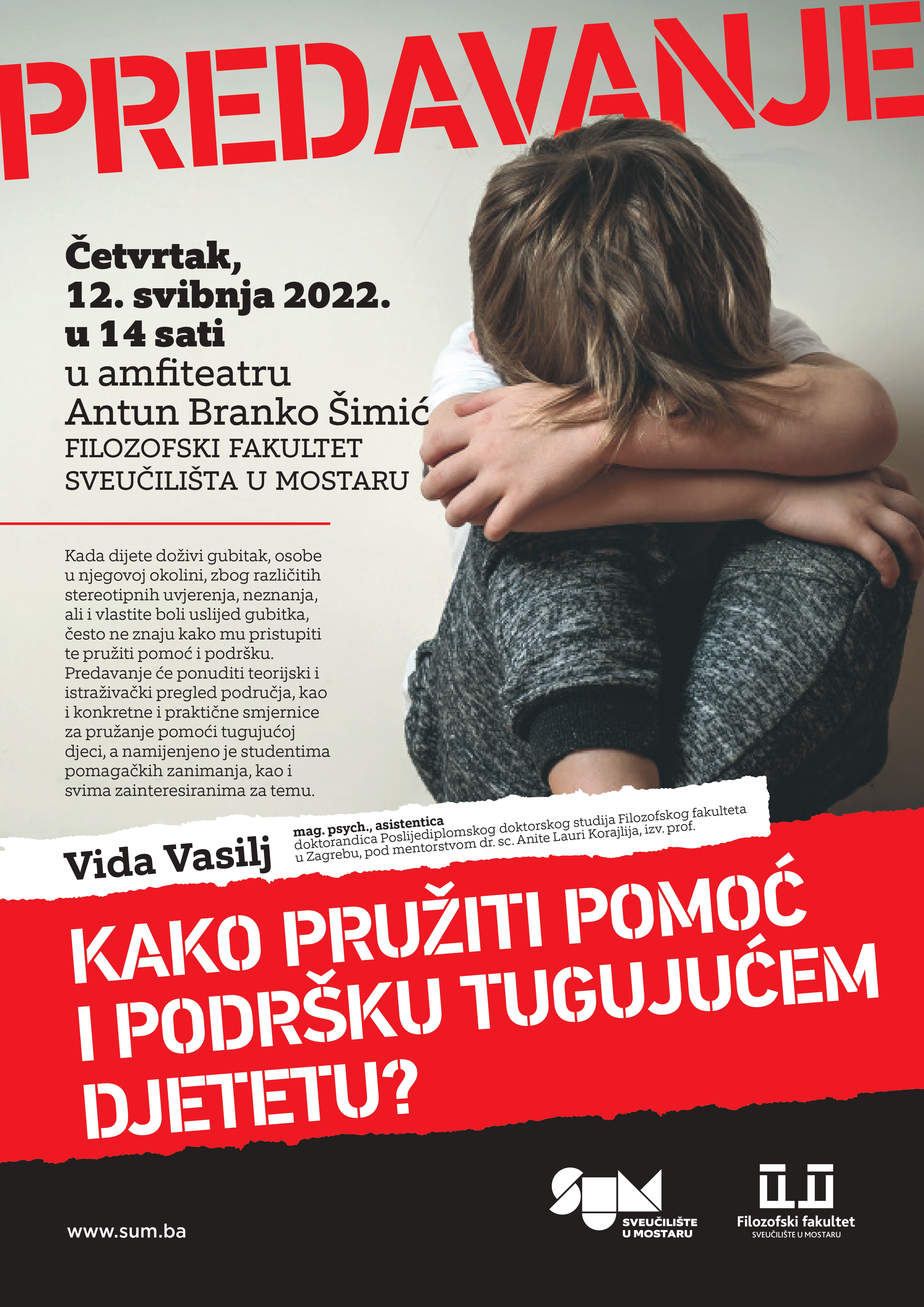 Predavanje na temu "Kako pružiti pomoć i podršku tugujućem djetetu?" održat će se u četvrtak 12. svibnja u 14.00 sati u amfiteatru Antun Branko Šimić na Filozofskom fakultetu Sveučilišta u Mostaru.