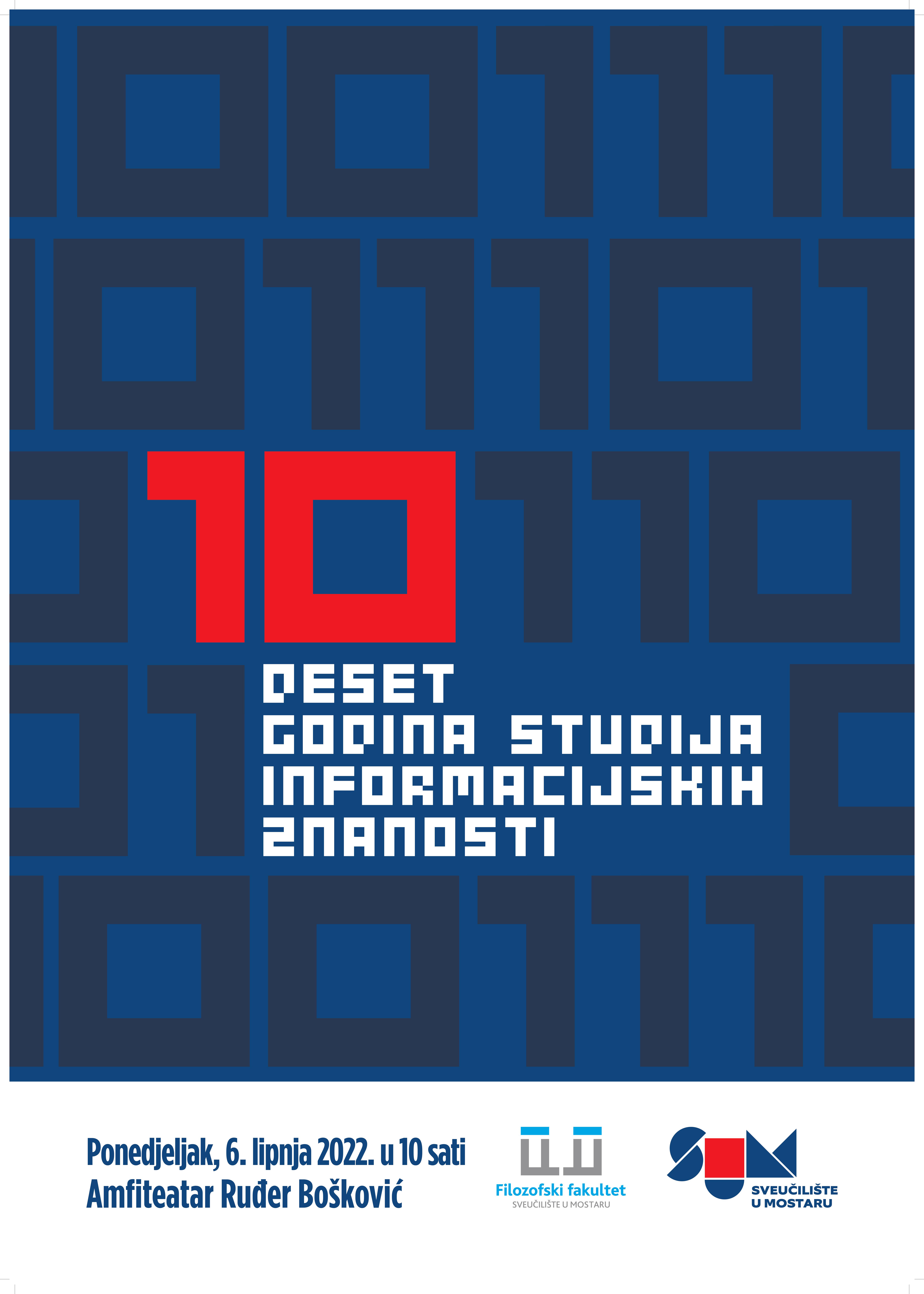 Obilježavanje deset godina studija Informacijskih znanosti održat će se u ponedjeljak 6. lipnja u 10.00 sati u amfiteatru Ruđer Bošković na Filozofskom fakultetu Sveučilišta u Mostaru.