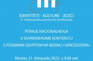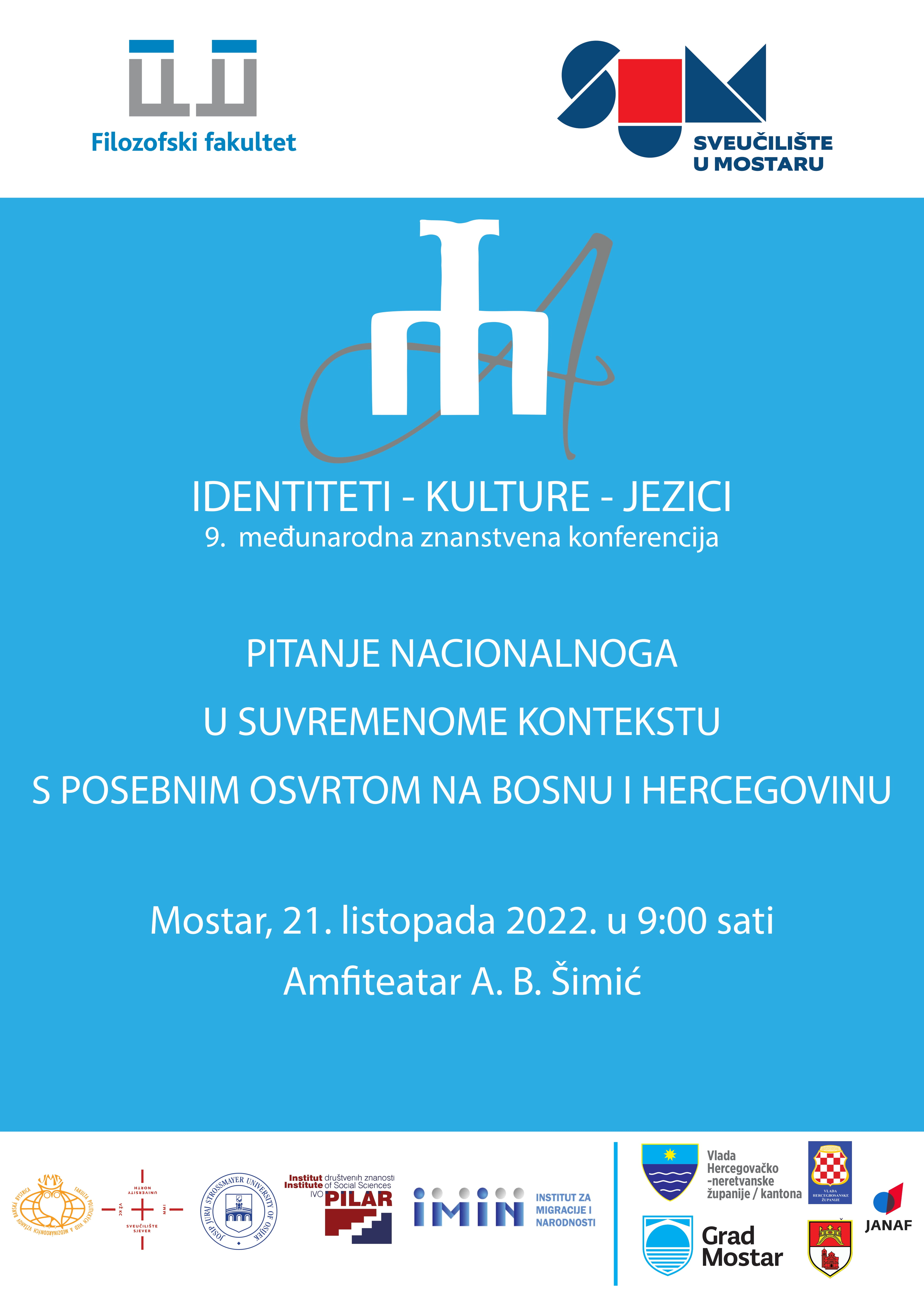 Na Filozofskom fakultetu Sveučilišta u Mostaru bit će održana 9. međunarodna znanstvena konferencija IDENTITETI – KULTURE – JEZICI 21. listopada 2022. u amfiteatru A. B. Šimić u 9:00 sati. Tema je ovogodišnje konferencije Pitanje nacionalnoga u suvremenome kontekstu s posebnim osvrtom na Bosnu i Hercegovinu.