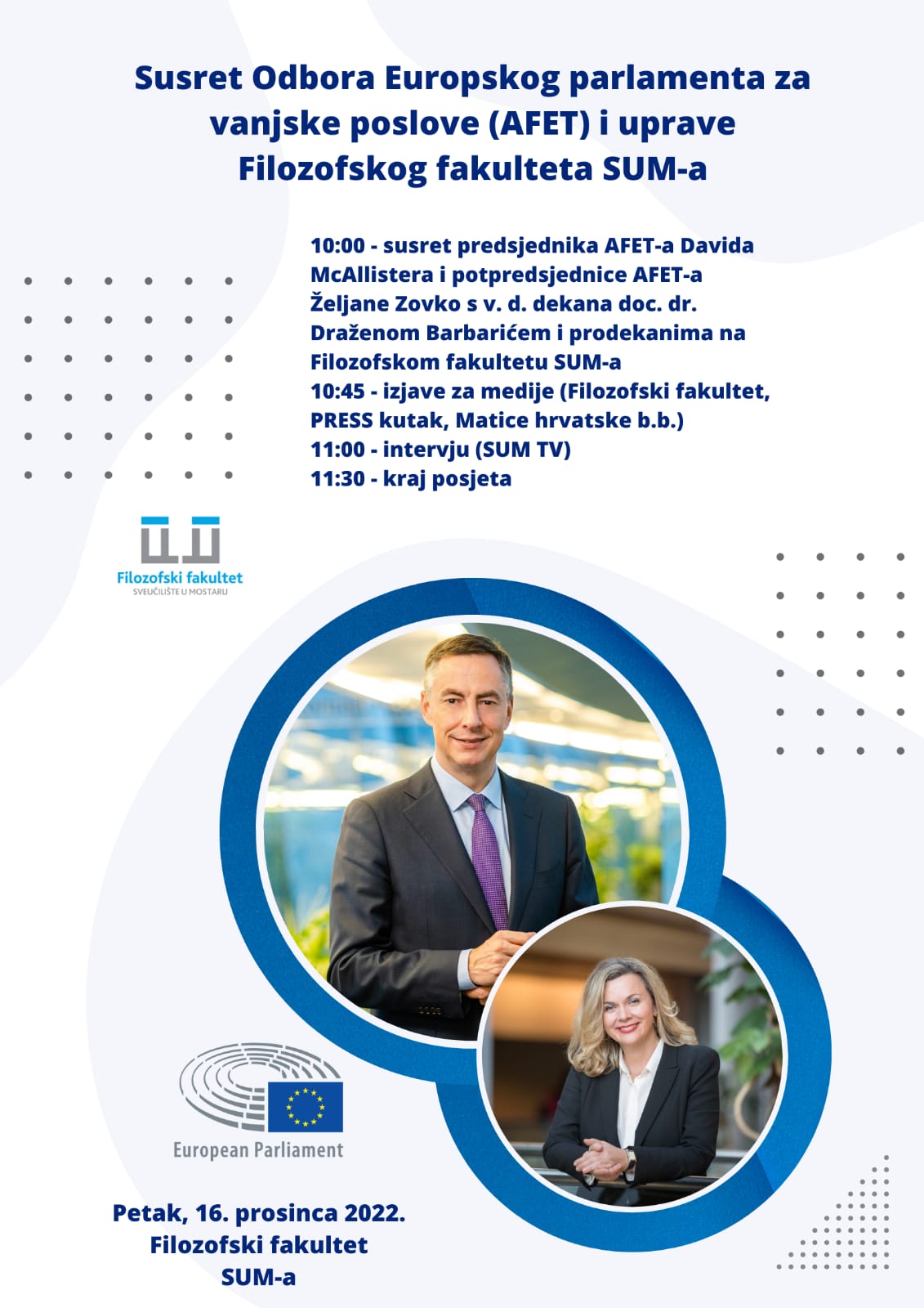 Na Filozofskom fakultetu Sveučilišta u Mostaru (SUM) bit će održan susret predsjednika Odbora Europskog parlamenta za vanjske poslove (AFET), Davida McAllistera i potpredsjednice Željane Zovko s v.d. dekanom Filozofskog fakulteta doc. dr. sc. Draženom Barbarićem i prodekanima 16. prosinca (petak) u 10.00 sati.