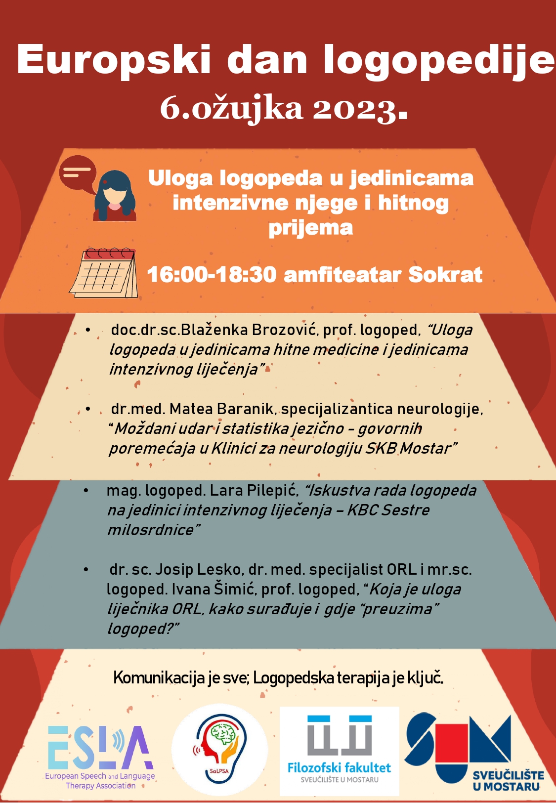 Proslavni dan obilježiti će se u ponedjeljak, 6. ožujka 2023. godine u amfiteatru Sokrat Filozofskog fakulteta Sveučilišta u Mostaru s početkom u 16.00 sati. Predavanja na ovogodišnju temu „Uloga logopeda u jedinicama intenzivne njege i hitnog prijema“ održat će stručnjaci iz područja logopedije, neurologije i otorinolaringologije (ORL).