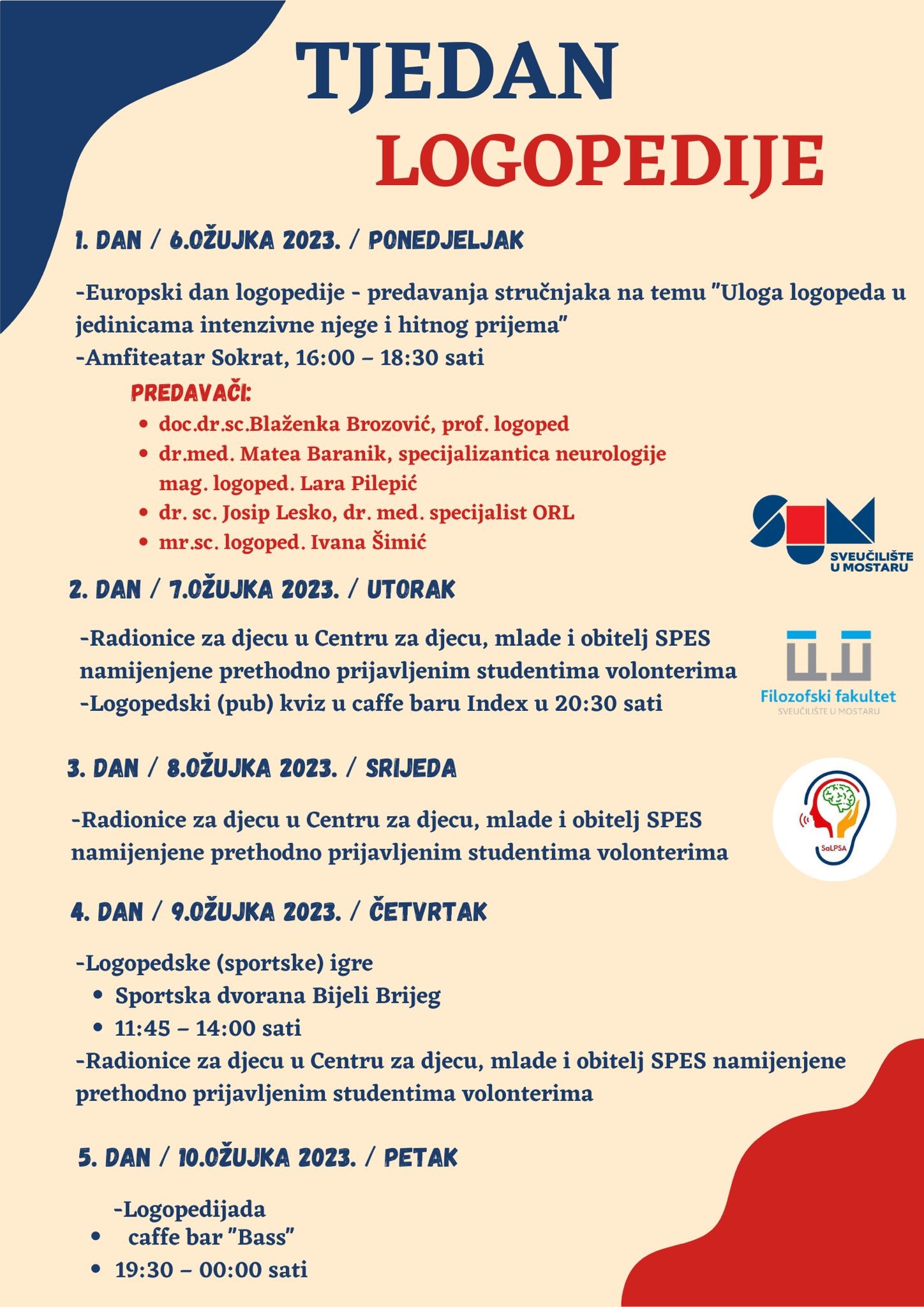 Udruga studenata logopedije SaLPSA u suradnji sa Studijom logopedije i Filozofskim fakultetom Sveučilišta u Mostaru organizira „Tjedan logopedije“ od 6. do 10. ožujka 2023. godine.