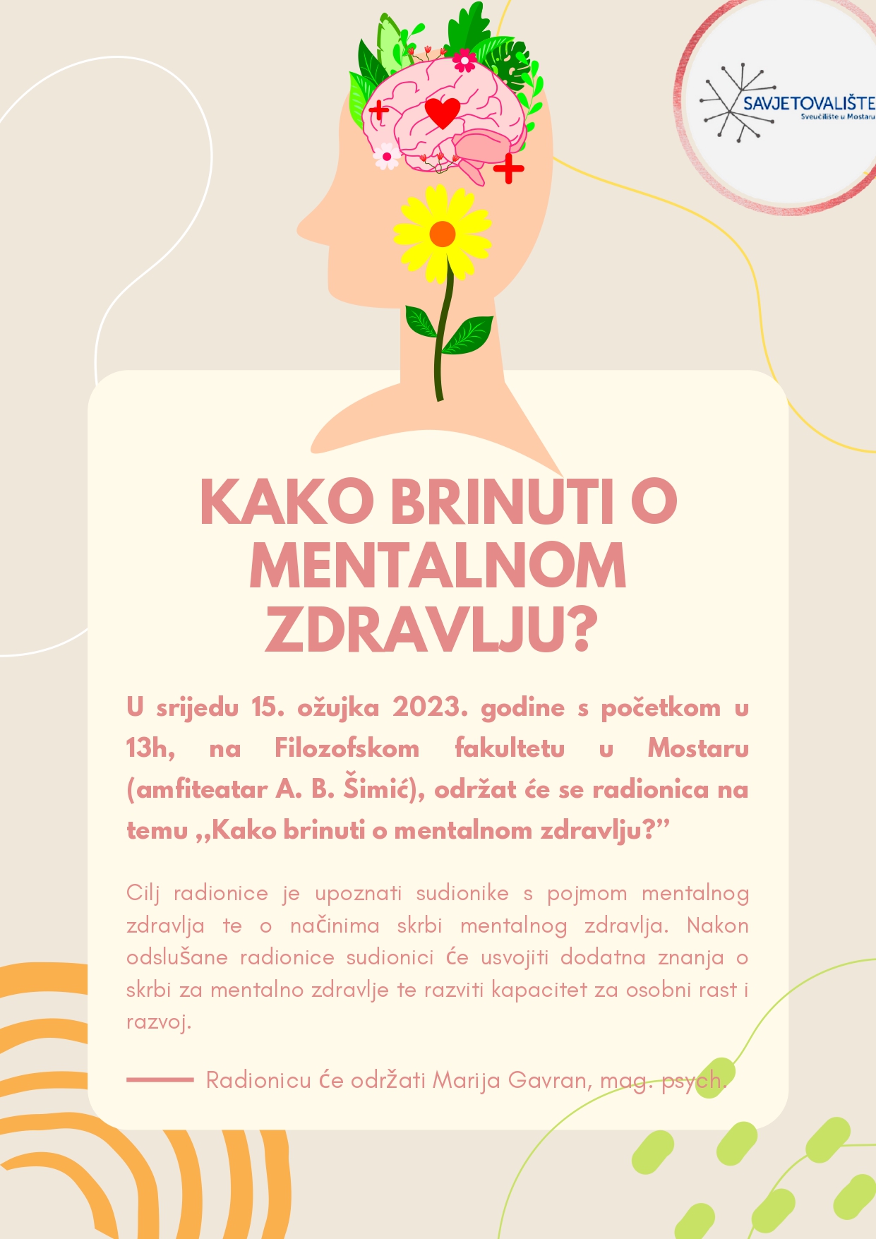 Na Filozofskom fakultetu Sveučilišta u Mostaru u sklopu aktivnosti Studentskog savjetovališta biti će održana radionica na temu „Kako brinuti o mentalnom zdravlju?“ 15. ožujka (srijeda) u amfiteatru Antun Branko Šimić u 13.00 sati. Radionicu će održati Marija Gavran, mag. psy., a namjenjena je svim studentima SUM-a.
