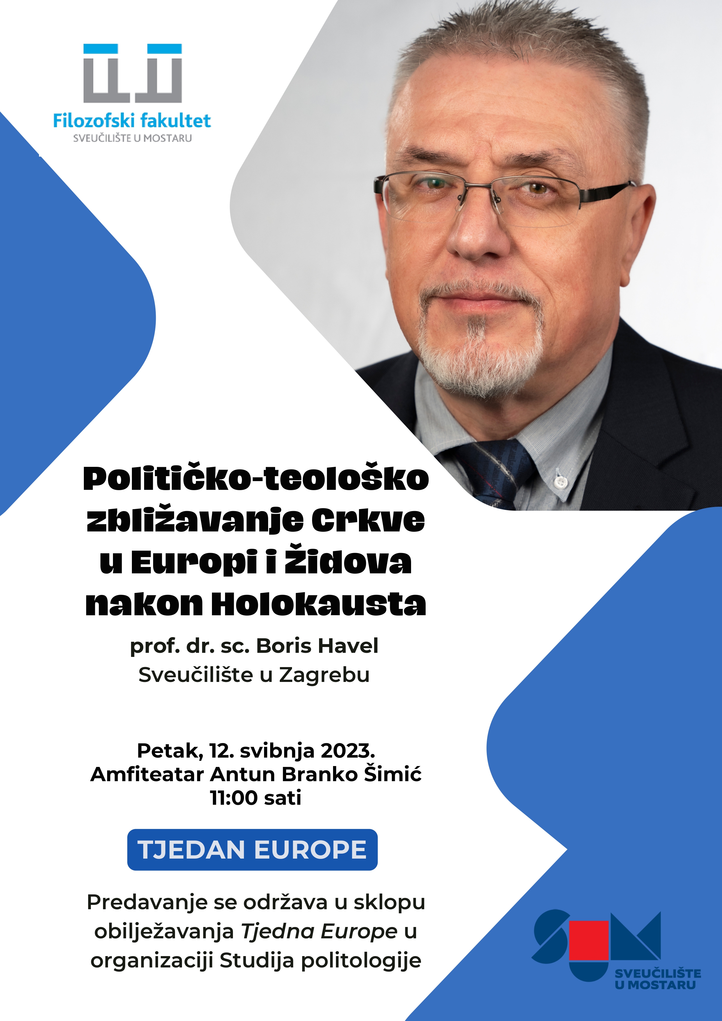 Na Filozofskom fakultetu Sveučilišta u Mostaru prof. dr. sc. Boris Havel sa Sveučilišta u Zagrebu održat će predavanje o temi „Političko-teološko zbližavanje Crkve u Europi i Židova nakon holokausta“ 12. svibnja (petak) u amfiteatru Antun Branko Šimić u 11.00 sati.