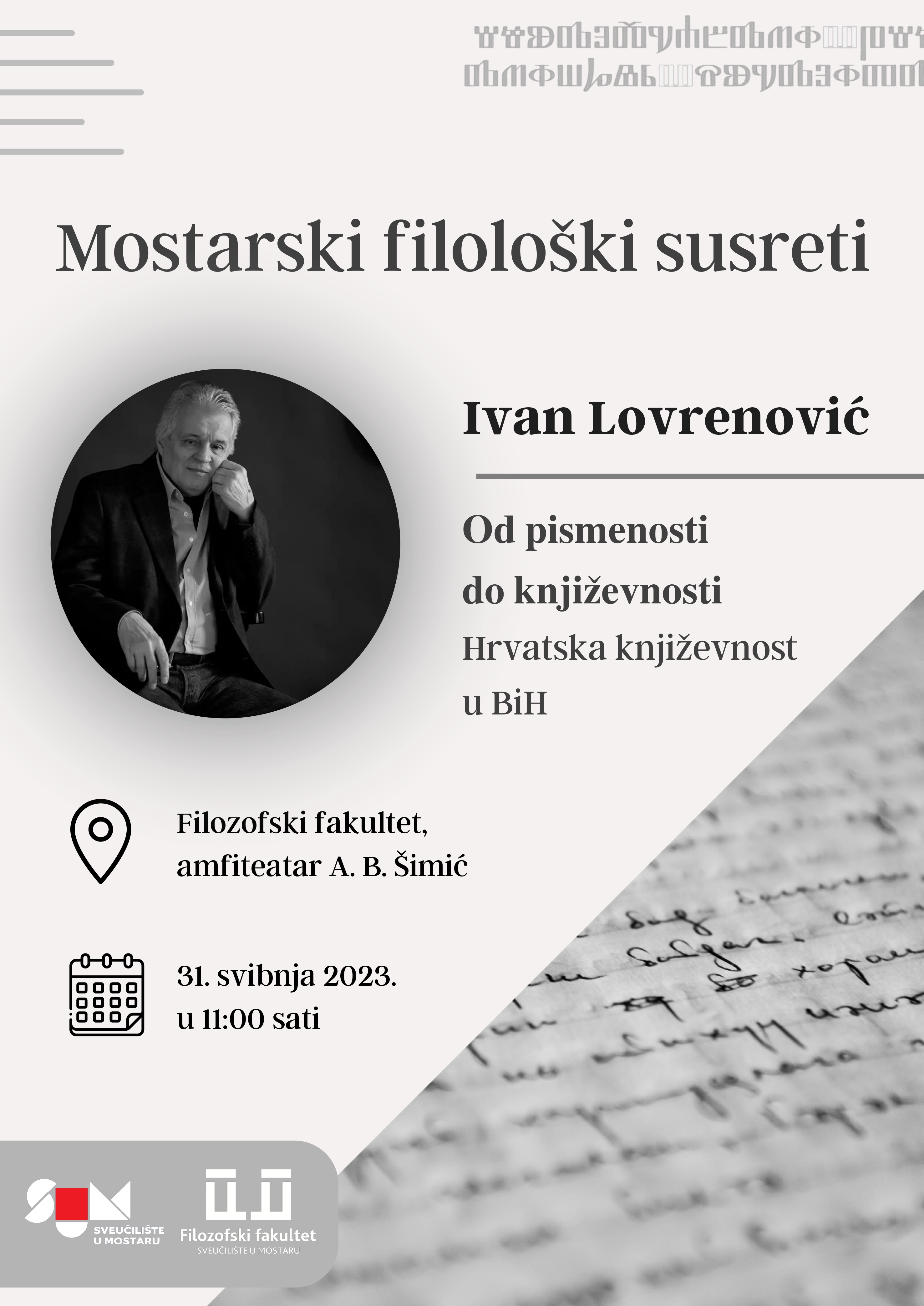 Na Filozofskom fakultetu Sveučilišta u Mostaru bit će održano predavanje na temu „Od pismenosti do književnosti: Hrvatska književnost u BiH“ književnika Ivana Lovrenovića 31. svibnja (srijeda) u amfiteatru Antun Branko Šimić u 11.00 sati.