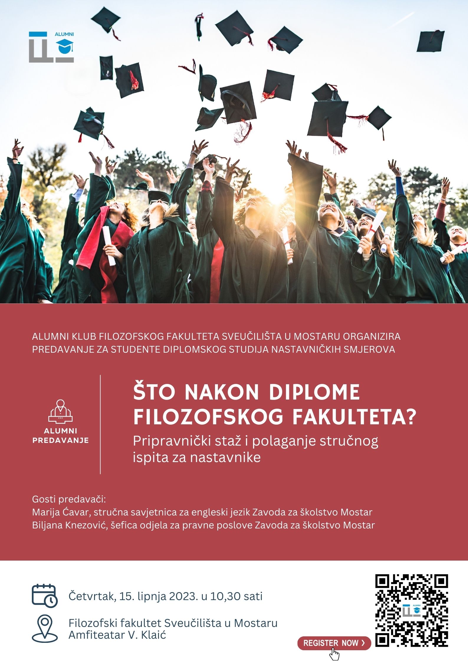 Alumni klub Filozofskog fakulteta Sveučilišta u Mostaru u suradnji sa Zavodom za školstvo Mostar organizira predavanje pod nazivom „Što nakon diplome Filozofskog fakulteta? Pripravnički staž i polaganje stručnog ispita za nastavnike“. Predavanje je namijenjeno studentima diplomskog studija nastavničkih smjerova, a održat će se na Filozofskom fakultetu Sveučilišta u Mostaru u četvrtak, 15. lipnja 2023. s početkom u 10:30 sati.