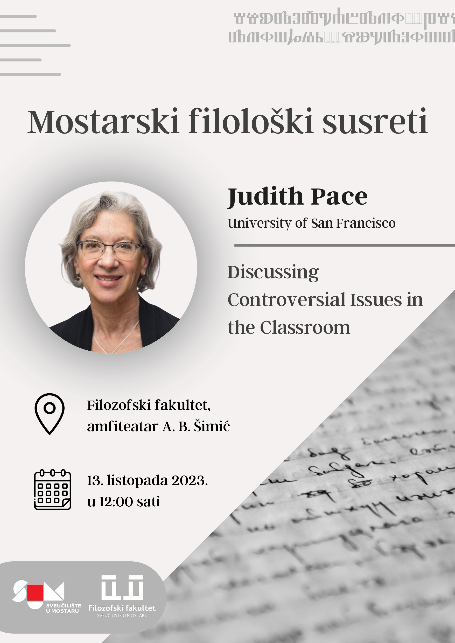 Na Filozofskom fakultetu Sveučilišta u Mostaru prof. dr. sc. Judith Pace sa Sveučilišta San Francisco održat će predavanje na temu "Discussing Controversial Issues in the Classroom" 13. listopada (petak) u amfiteatru Antun Branko Šimić u 12.00 sati.