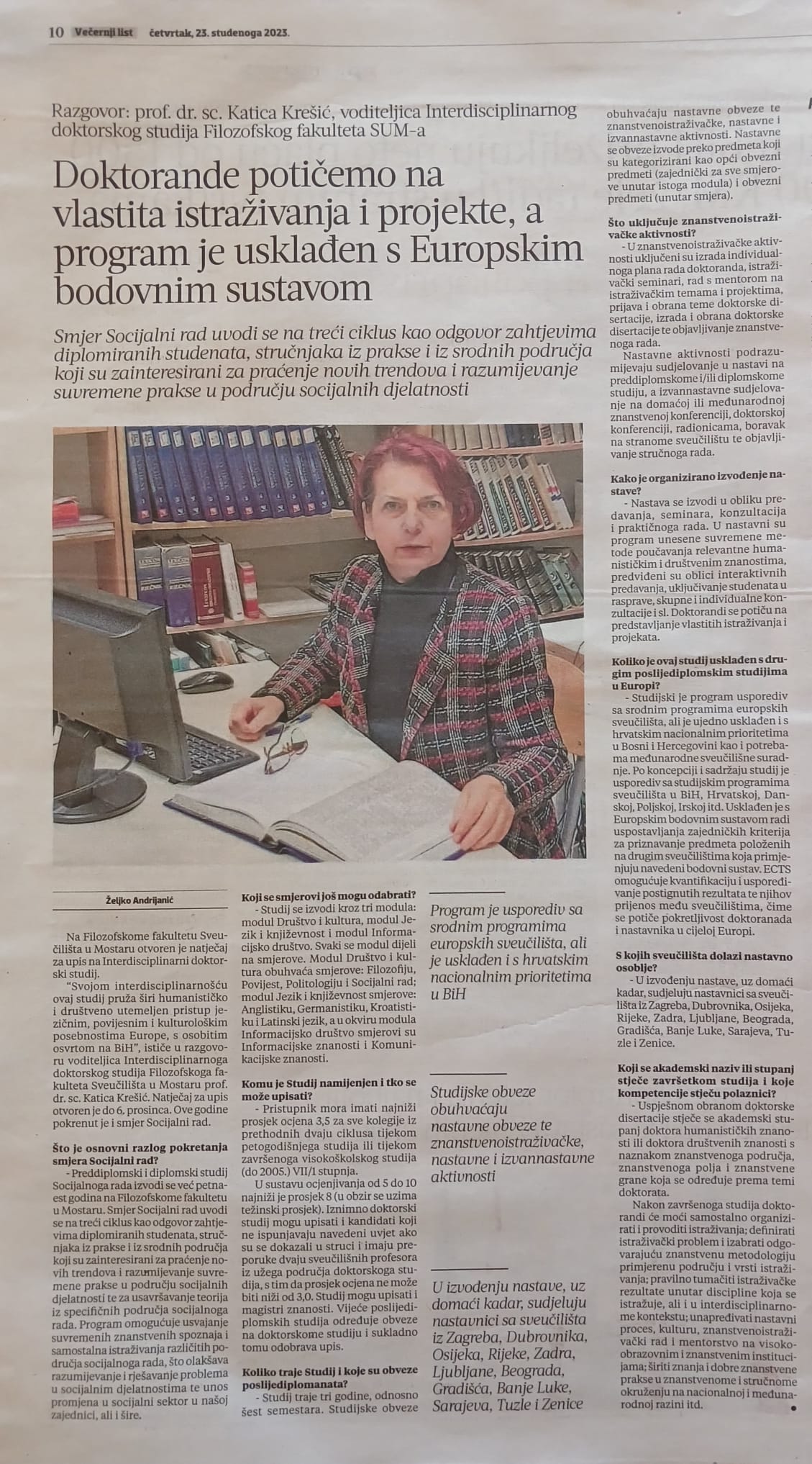 „Interdisciplinarni doktorski studij Filozofskog fakulteta Sveučilišta u Mostaru usklađen je s Europskim bodovnim sustavom radi uspostavljanja zajedničkih kriterija za priznavanje predmeta položenih na drugim sveučilištima koja primjenjuju navedeni bodovni sustav“, rekla je voditeljica Interdisciplinarnog doktorskog studija Filozofskog fakulteta SUM-a prof. dr. sc. Katica Krešić.