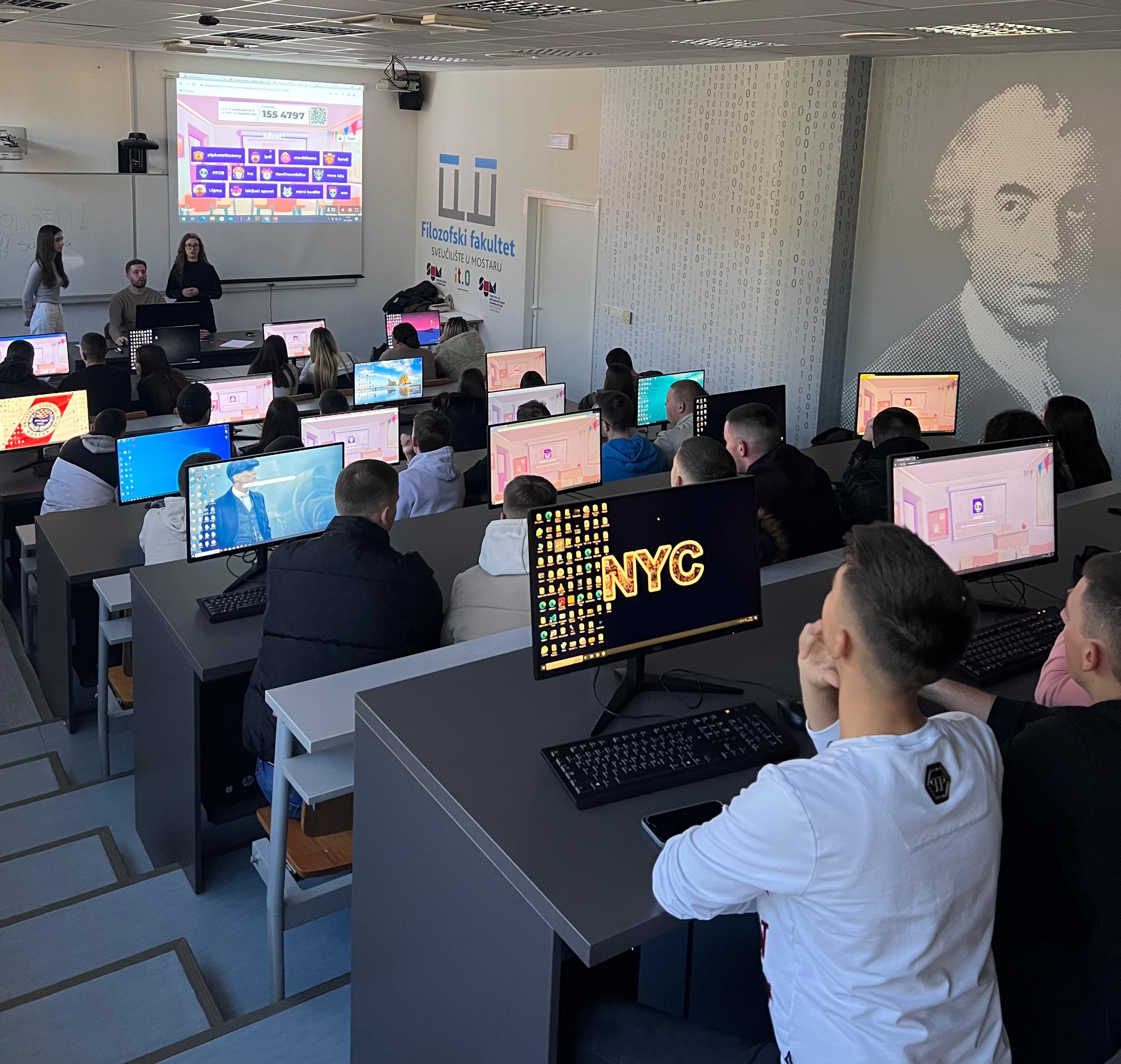 Predsjednik Kluba studenata informacijskih znanosti Ivan Miletić i članice Kluba Helena Barać i Ana Raguž maturantima su održali interaktivni kviz i radionicu o softverskim alatima za izradu multimedijskog sadržaja.