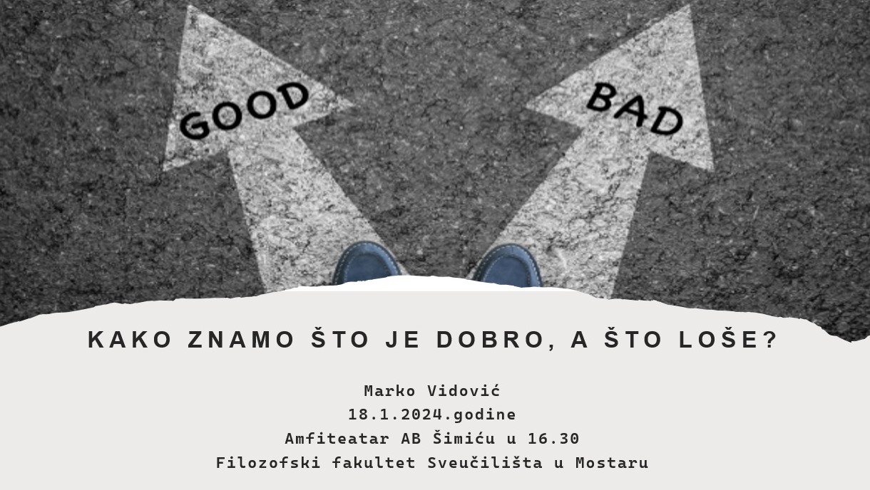 Radionicu u organizaciji Savjetovališta za studente pod nazivom “Podjela na dobro i loše kao granica u razumijevanju” održat će Marko Vidović, student diplomskog studija Psihologije 18. siječnja (četvrtak) u 16.30 sati u amfiteatru Antun Branko Šimić na Filozofskom fakultetu Sveučilišta u Mostaru.