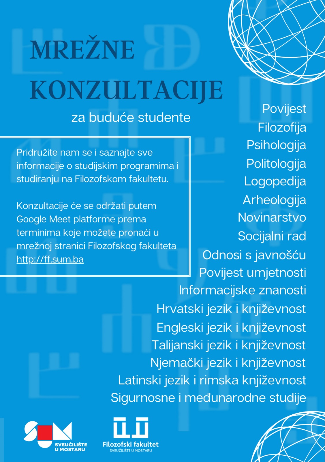 Filozofski fakultet Sveučilišta u Mostaru i ove akademske godine organizira mrežne konzultacije za maturante koje će se održati tijekom dva tjedna 21., 22. i 23. te 27., 28. i 29. veljače po jedan termin u tjednu za svaki studij.