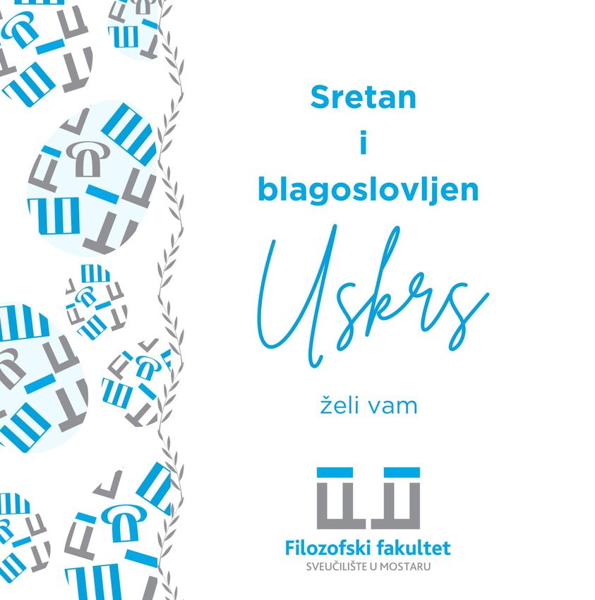Svim djelatnicima, studentima i suradnicima Filozofskog fakulteta Sveučilišta u Mostaru koji slave najveću kršćansku svetkovinu želimo sretan i blagoslovljen Uskrs!