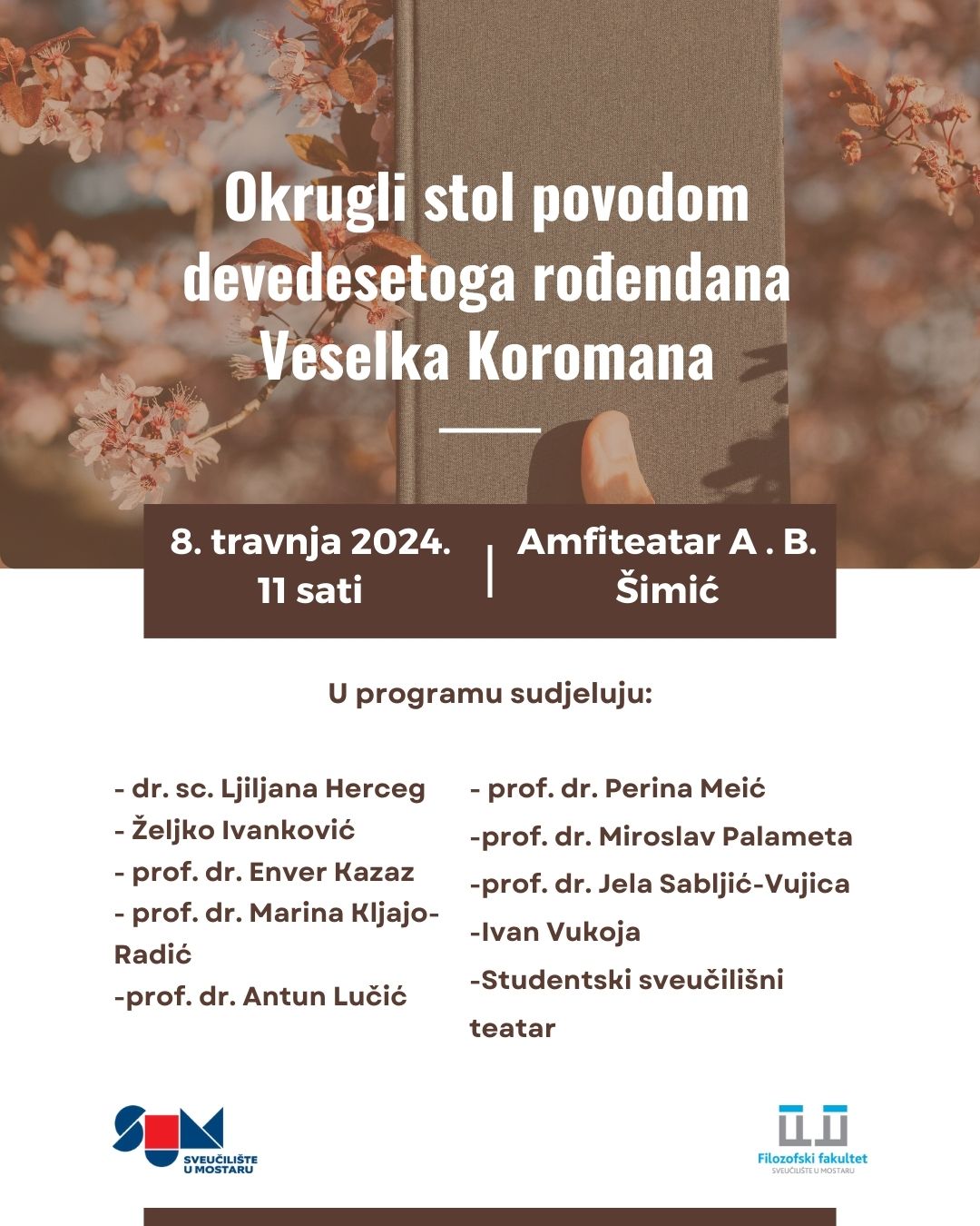 Na Filozofskom fakultetu Sveučilišta u Mostaru bit će održan okrugli stol povodom devedesetoga rođendana Veselka Koromana 8. travnja (ponedjeljak) u 11.00 sati u amfiteatru Antun Branko Šimić.