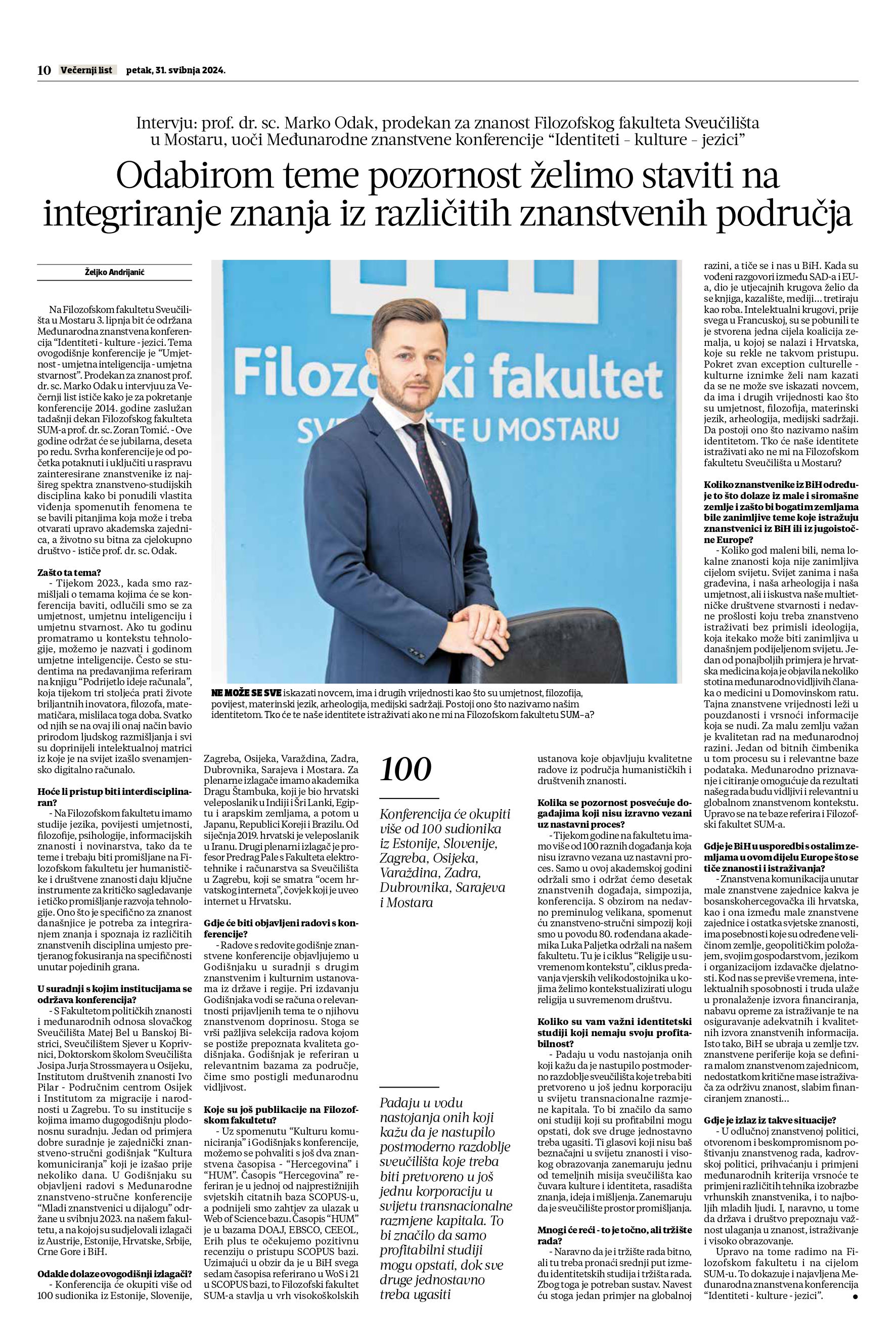 Na Filozofskom fakultetu Sveučilišta u Mostaru 3. lipnja bit će održana jubilarna deseta Međunarodna znanstvena konferencije Identiteti – Kulture – Jezici. Tema ovogodišnje konferencije je Umjetnost – Umjetna inteligencija – Umjetna stvarnost. Prodekan za znanost toga Fakulteta prof. dr. sc. Marko Odak u intervjuu za Večernji list je istaknuo kako će konferencija okupiti više od 100 sudionika iz Estonije, Slovenije, Zagreba, Osijeka, Varaždina, Zadra, Dubrovnika, Sarajeva i Mostara.