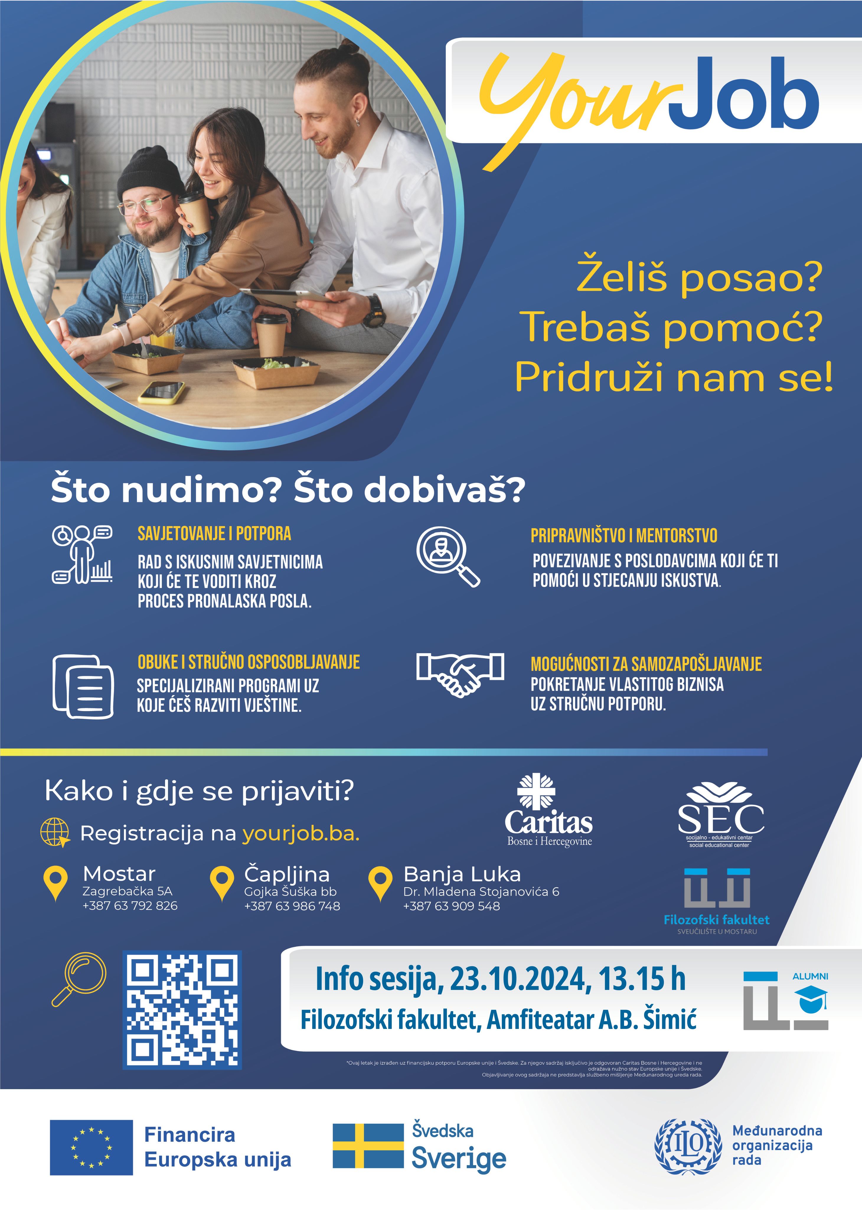 Informativna sesija o projektu YourJob održat će na Filozofskom fakultetu SUM-a 23. listopada 2024. godine u 13.15 sati u Amfiteatru A.B. Šimić. Na ovoj sesiji bit će predstavljen projekt, njegov ciljevi te mogućnosti koje pruža mladim osobama na području grada Mostara i Čapljine.