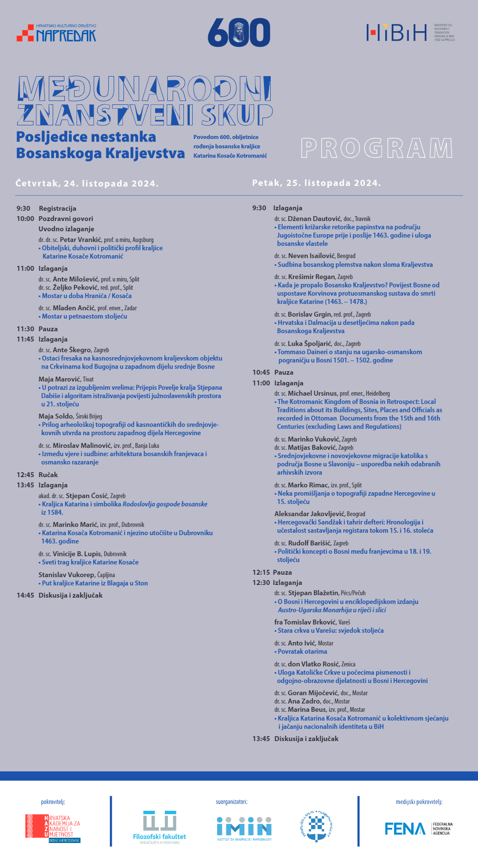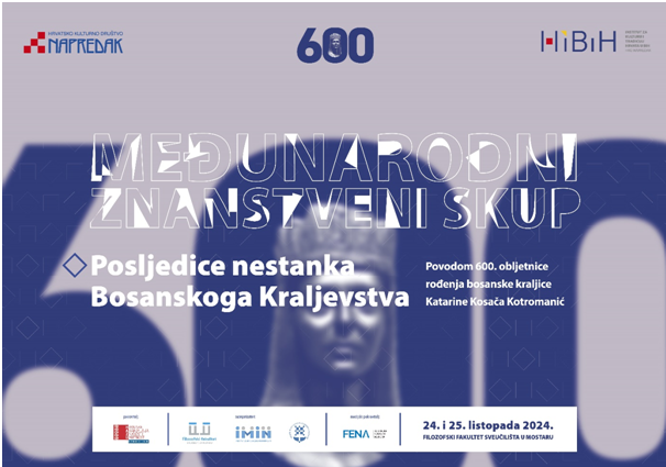 Međunarodni znanstveni skup „Posljedice nestanka Bosanskoga Kraljevstva“, u povodu 600. obljetnice rođenja bosanske kraljice Katarine Kosača Kotromanić, bit će održan 24. i 25. listopada 2024. godine u 10.00 sati na Filozofskom fakultetu Sveučilišta u Mostaru u amfiteatru Antun Branko Šimić.