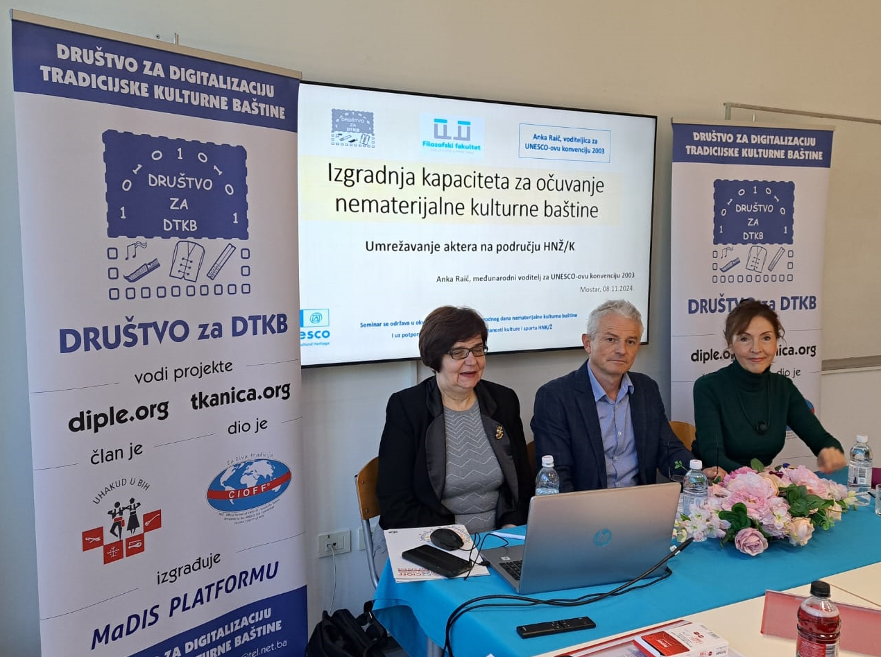 Na Filozofskom fakultetu Sveučilišta u Mostaru održan je seminar o izgradnji kapaciteta za očuvanje nematerijalne kulturne baštine baziranih na preporukama i konvencijama UNESCO-a u organizaciji Društva za digitalizaciju tradicijske kulturne baštine i Anke Raič, međunarodnog facilitatora za UNESCO-ovu Konvenciju o očuvanju nematerijalne kulturne baštine.