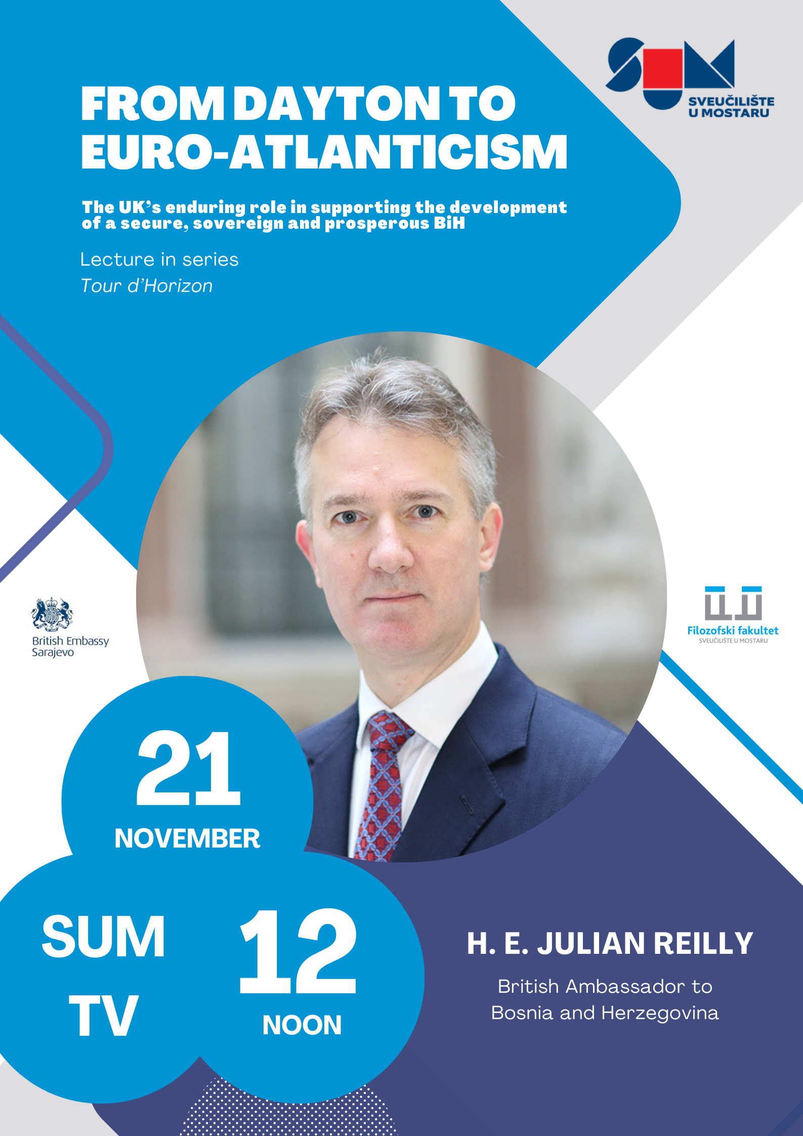 Na Filozofski fakultet Sveučilišta u Mostaru u posjet dolazi veleposlanik Velike Britanije u Bosni i Hercegovini Nj. E. Julian Reilly i održat će predavanje na temu „Od Daytona do euroatlantizma: Trajna uloga Ujedinjenog Kraljevstva u potpori razvoju za sigurnu, suverenu i prosperitetnu BiH“ u četvrtak, 21. studenoga u 12.00 sati na Televiziji Sveučilišta u Mostaru (SUM TV).