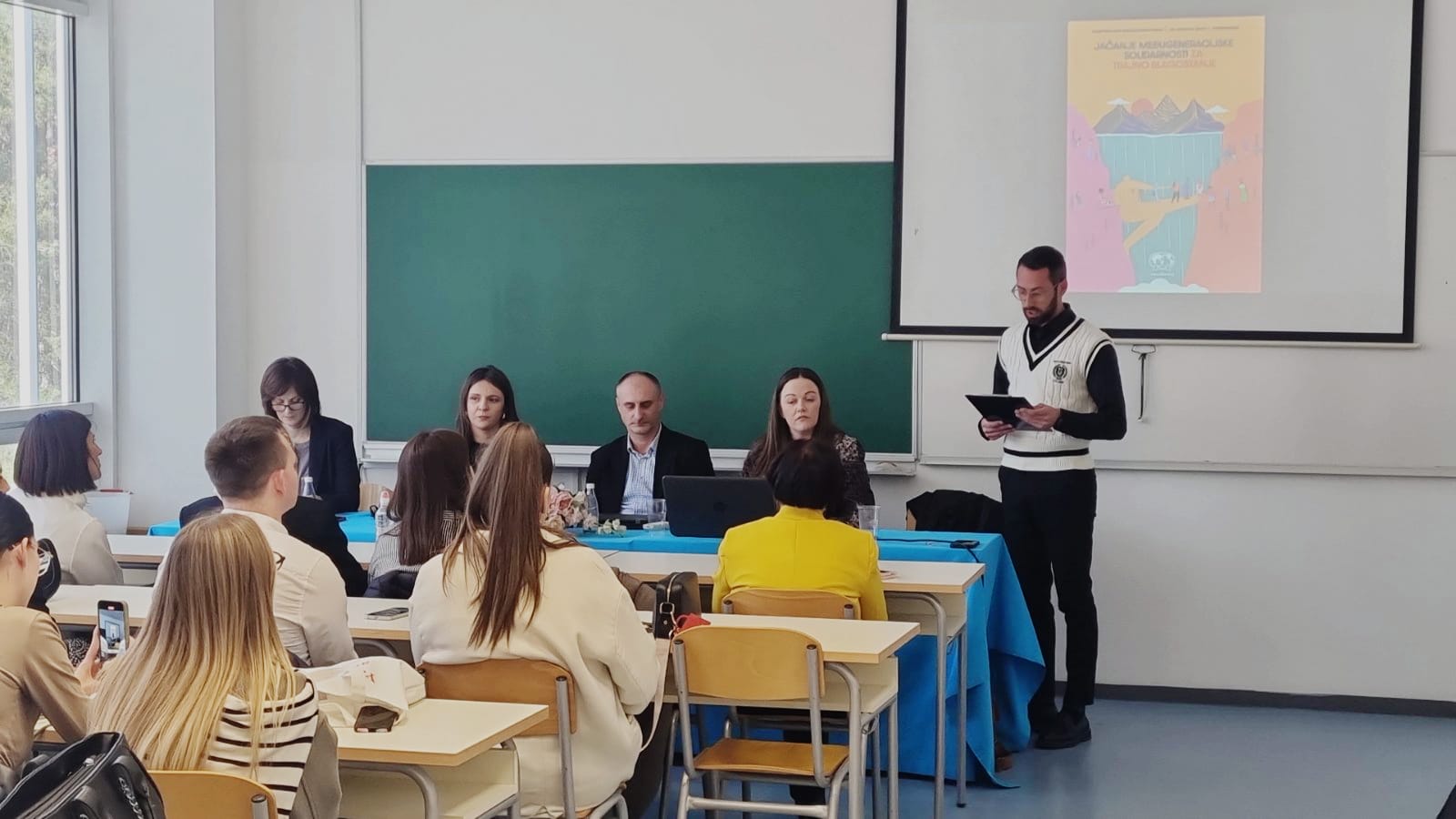 Anđelka Čuljak, asistentica na kolegiju Socijalna gerontologija na Socijalnom radu FF SUM-a iz područja svoga znanstvenog interesa dala je teorijsku podlogu i uvod u globalnu temu međugeneracijske solidarnosti. Iznijela je zabrinutost zbog starenja populacije te činjenicu da ne postoji međunarodna konvencija o zaštiti osoba starije životne dobi.