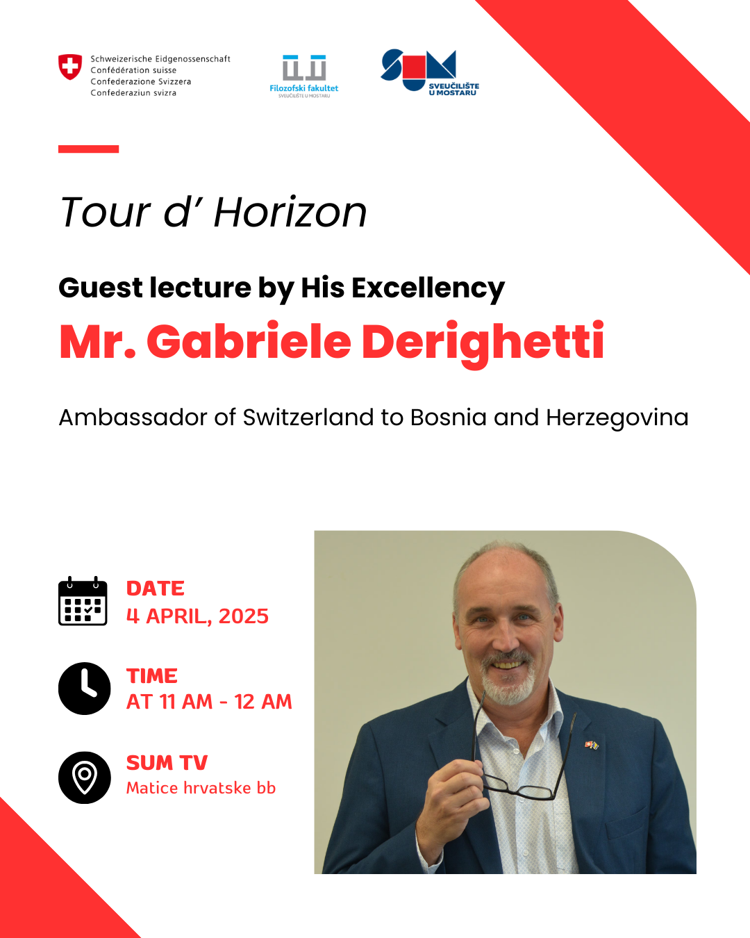 Na Filozofski fakultet Sveučilišta u Mostaru u posjet dolazi veleposlanik Švicarske u Bosni i Hercegovini Nj. E. Gabriele Derighetti i održat će predavanje studentima u petak, 4. travnja u 11.00 sati na Televiziji Sveučilišta u Mostaru (SUM TV).