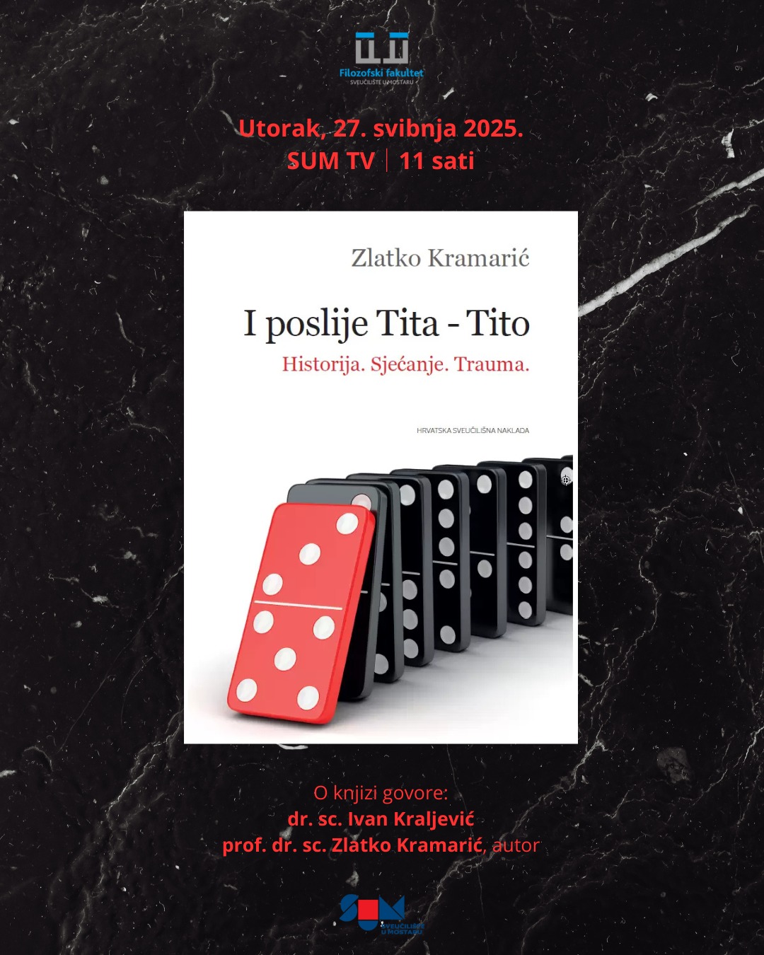 Na Filozofskom fakultetu Sveučilišta u Mostaru bit će predstavljena knjiga „I poslije Tita – Tito: Historija. Sjećanje. Trauma.“ autora Zlatka Kramarića 27. svibnja na SUM TV-u u 11.00 sati.