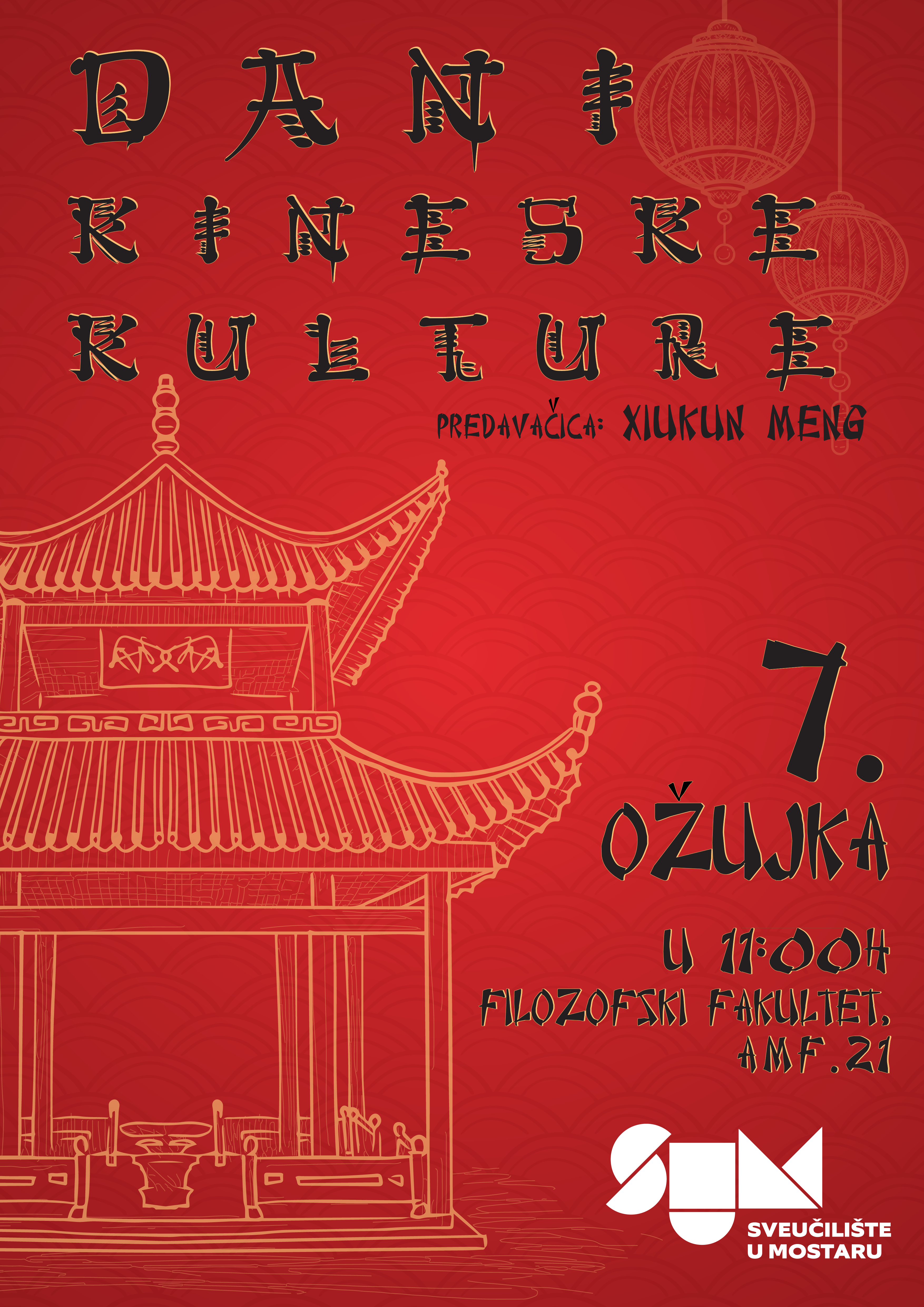 Na Filozofskome fakultetu Sveučilišta u Mostaru bit će predstavljanje kineske kulture kroz niz predavanja koja će se održavati svaki prvi tjedan u mjesecu do kraja semestra pod nazivom Dani kineske kulture. Prvo predavanje bit će održano 7. ožujka (četvrtak) u 11 sati u amfiteatru Gabrijel Jurkić.