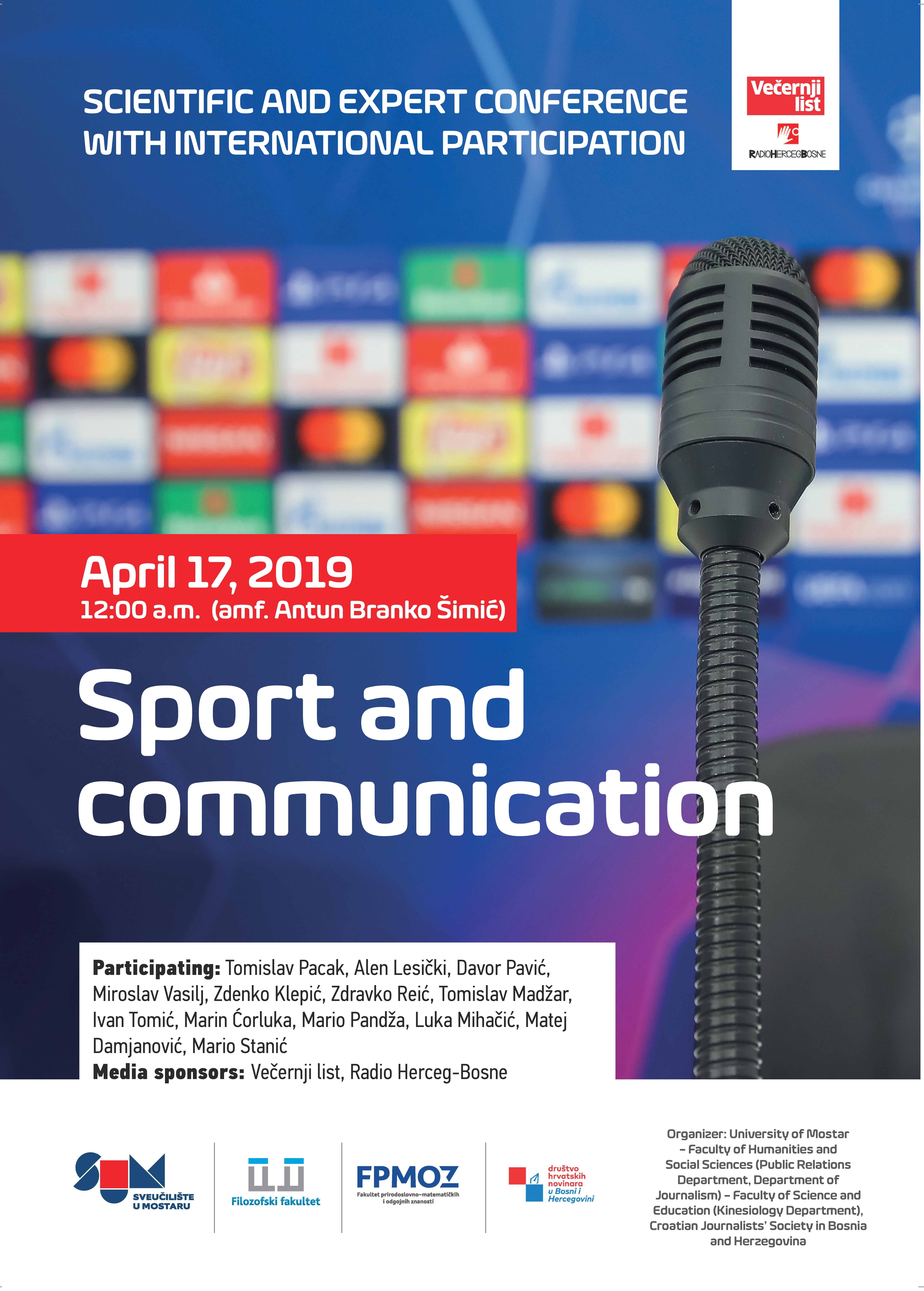 U organizaciji Sveučilišta u Mostaru, ustrojbenih jedinica Filozofskoga fakulteta (Studij odnosa s javnošću, Studij novinarstva) i Fakulteta prirodoslovno-matematičkih i odgojnih znanosti (Studij kineziologije) te Društva hrvatskih novinara u BiH održat će se znanstveno-stručna konferencija s međunarodnim sudjelovanjem „Sport i komunikacija“ 17. travnja (srijeda) u 12 sati u amfiteatru Antun Branko Šimić na Filozofskome fakultetu.