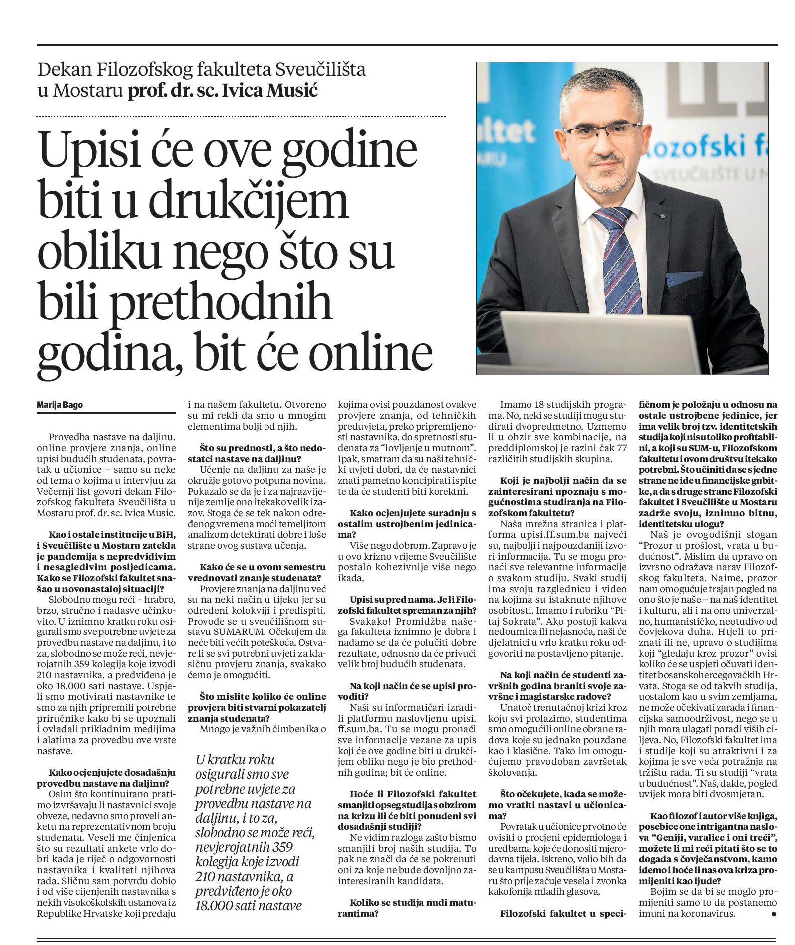 Provedba nastave na daljinu, online provjere znanja, online upisi budućih studenata, povratak u učionice – samo su neke od tema o kojima u intervjuu za Večernji list govori dekan Filozofskog fakulteta Sveučilišta u Mostaru prof. dr. sc. Ivica Musić.