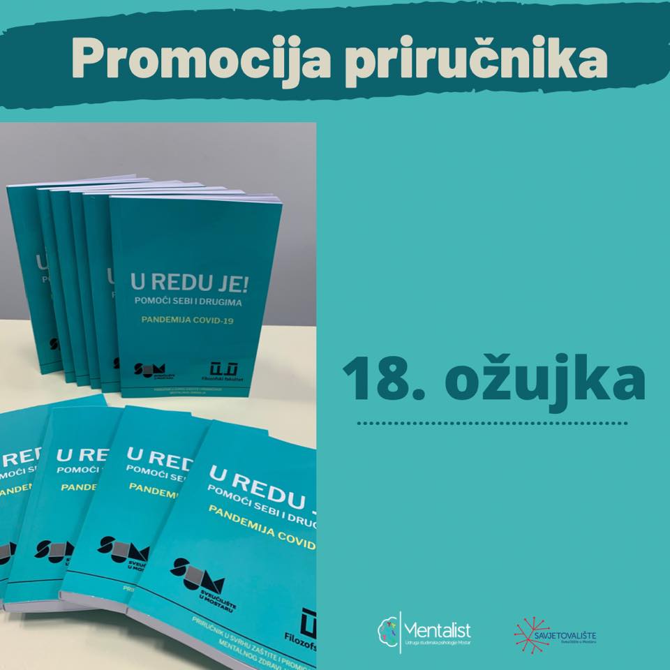 Promocija priručnika U redu je pomoći sebi i drugima, koji je nastao kao proizvod marljiva rada Studija psihologije u suradnji sa Savjetovalištem za studente Filozofskoga fakulteta Sveučilišta u Mostaru, održat će se 18. ožujka 2021. godine u 13 sati u amfiteatru Antun Branko Šimić.