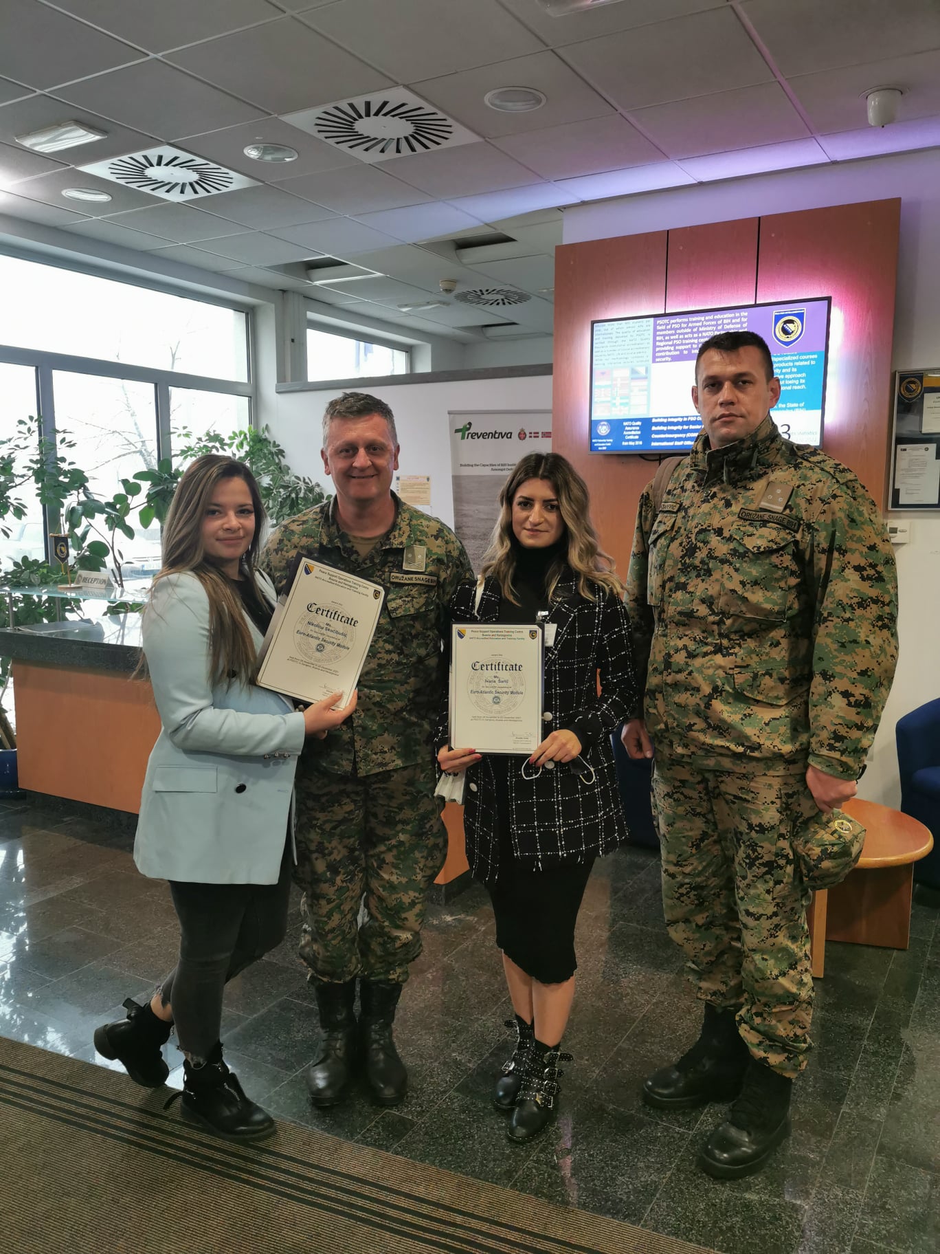 Studentice prve godine diplomskoga Studija politologije Ivana Šarić i Nikolina Skočibušić protekloga su tjedna pohađale i uspješno završile Modul o euroatlantskoj sigurnosti u PSOTC-u (Središte za obuku za operacije potpore miru u Butmiru), koji je izveden kao integrirani dio Stožernog časničkog tečaja za operacije potpore miru.