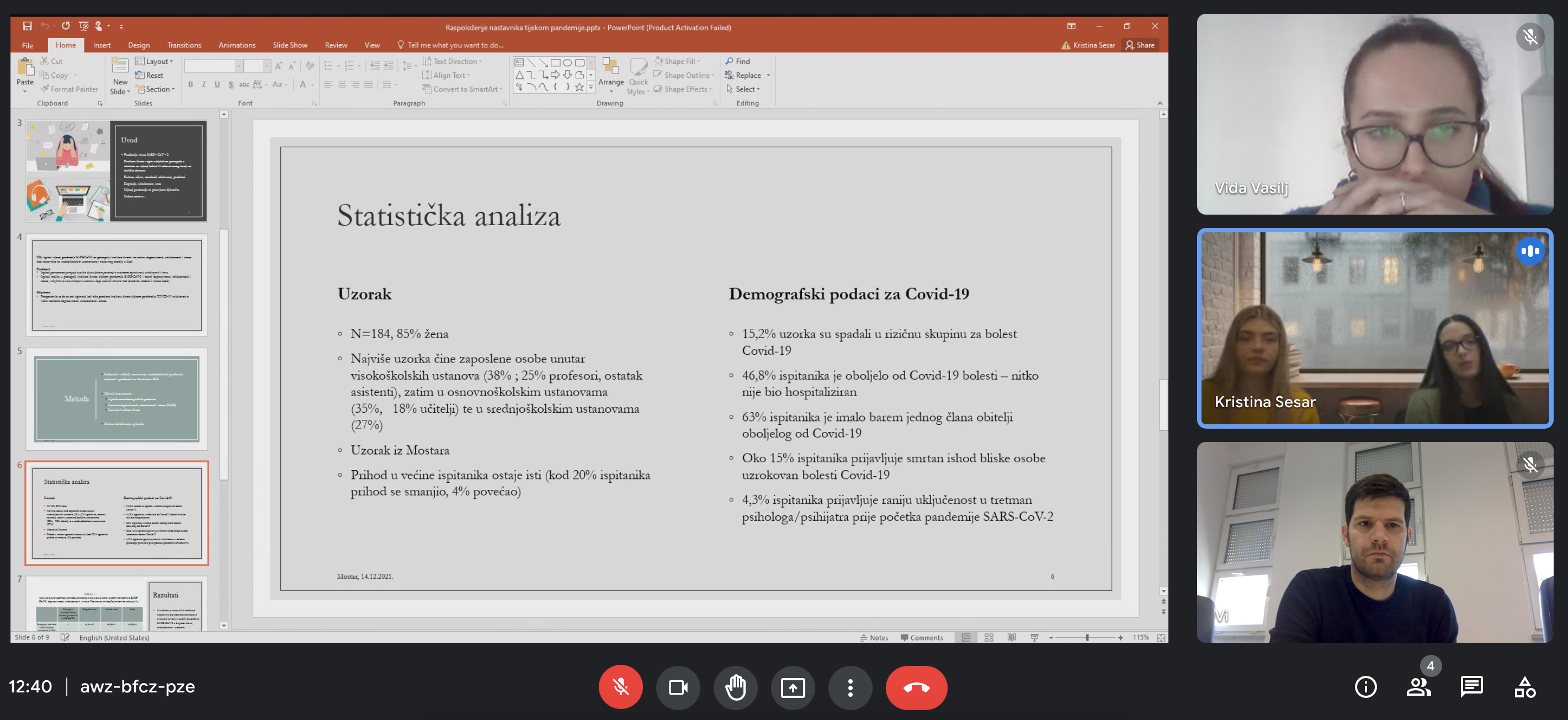 Pročelnica Studija psihologije Filozofskoga fakulteta SUM-a prof. dr. sc. Kristina Sesar je istaknula kako je pandemija COVID-19 bolesti imala značajan utjecaj na različita područja svakodnevnog funkcioniranja nastavnika kao i na nastavni proces.