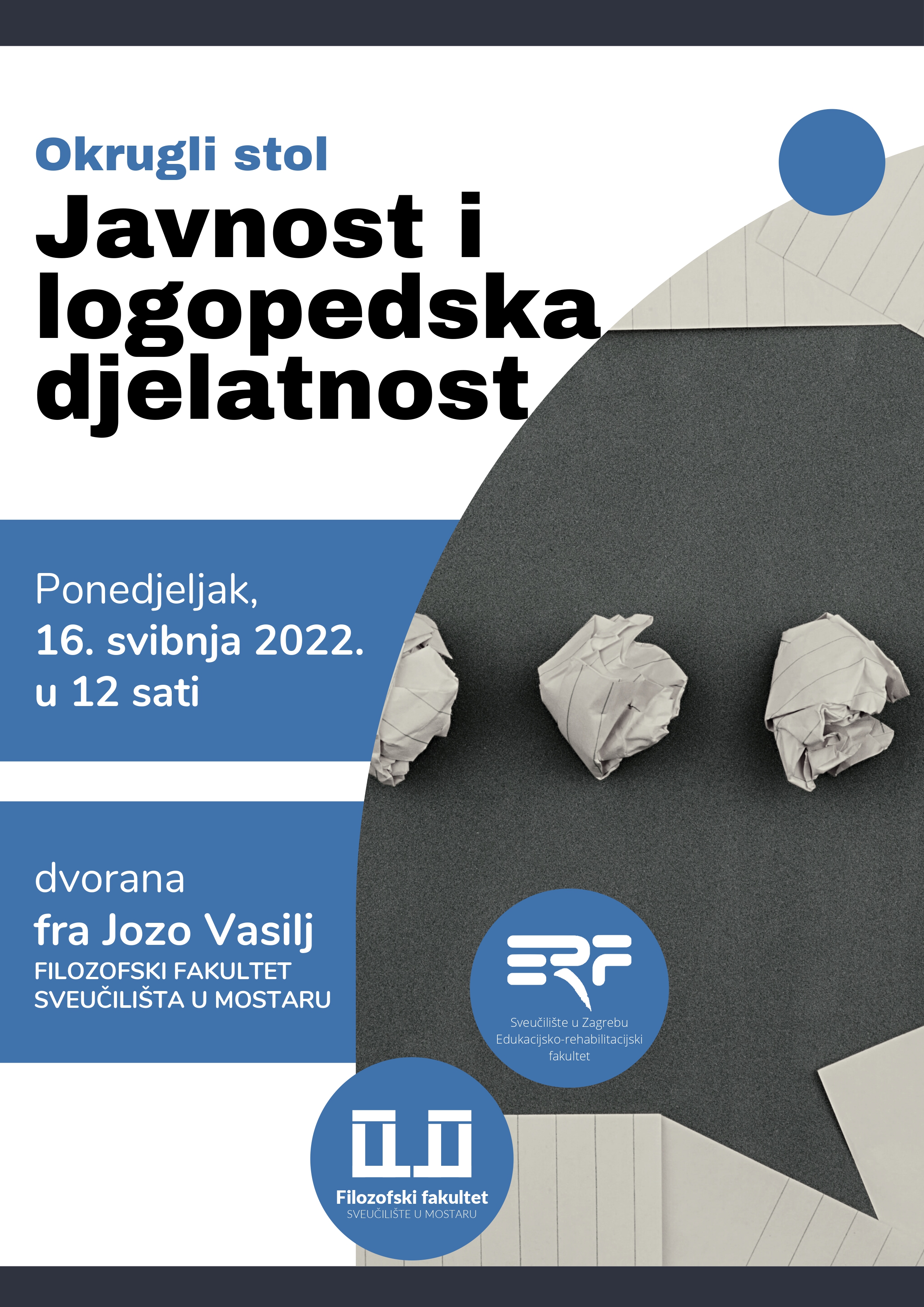 Na Filozofskom fakultetu Sveučilišta u Mostaru održat će se okrugli stol na temu Javnost i logopedska djelatnost 16. svibnja (ponedjeljak) u 12:00 sati u dvorani fra Jozo Vasilj. Okrugli stol se organizira u suradnji s Edukacijsko-rehabilitacijskim fakultetom Sveučilišta Zagreb.