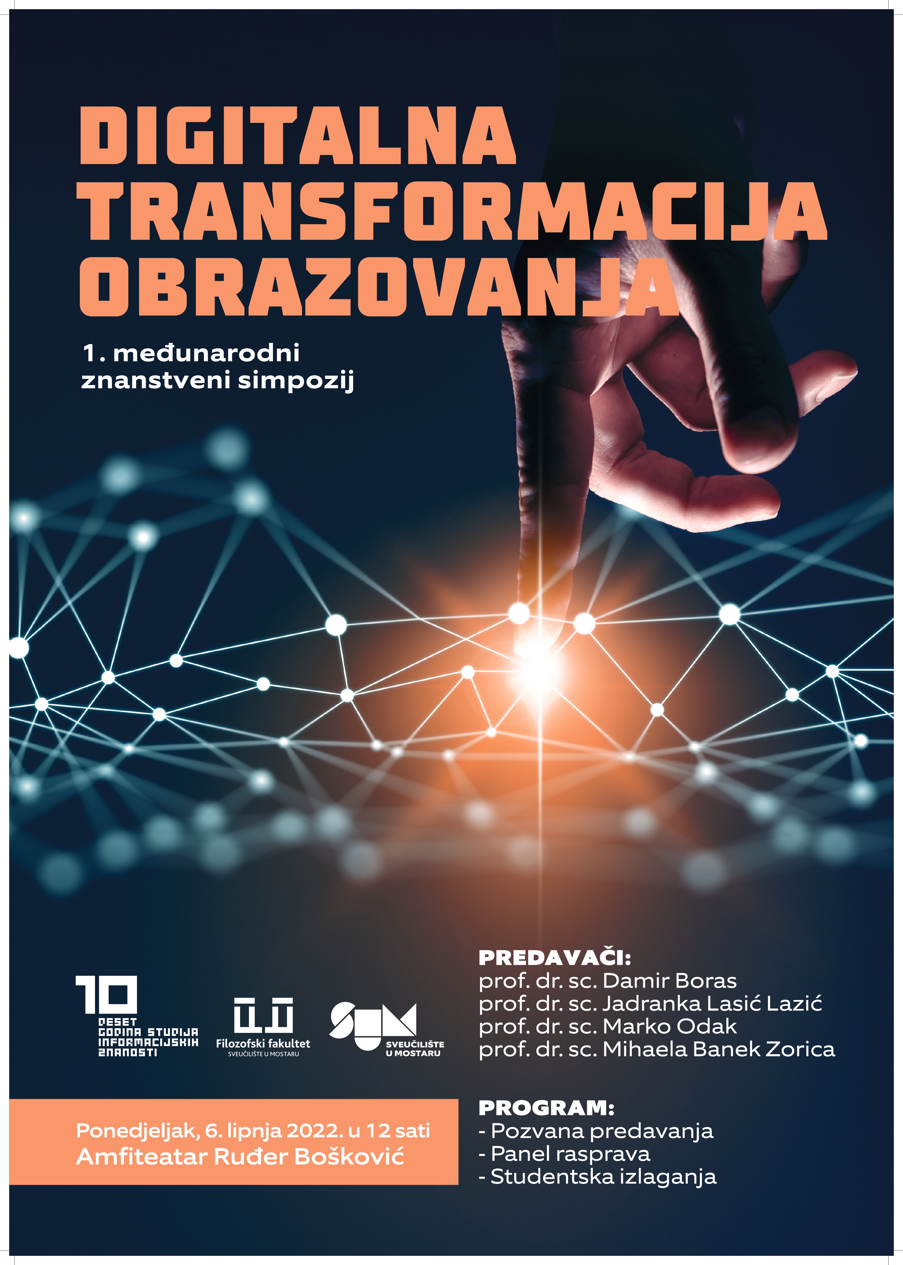 U okviru obilježavanja desete obljetnice studija Informacijskih znanosti na Filozofskom fakultetu bit će održan Međunarodni znanstveni simpozij Digitalna transformacija obrazovanja u ponedjeljak 6. lipnja u 12.00 sati.