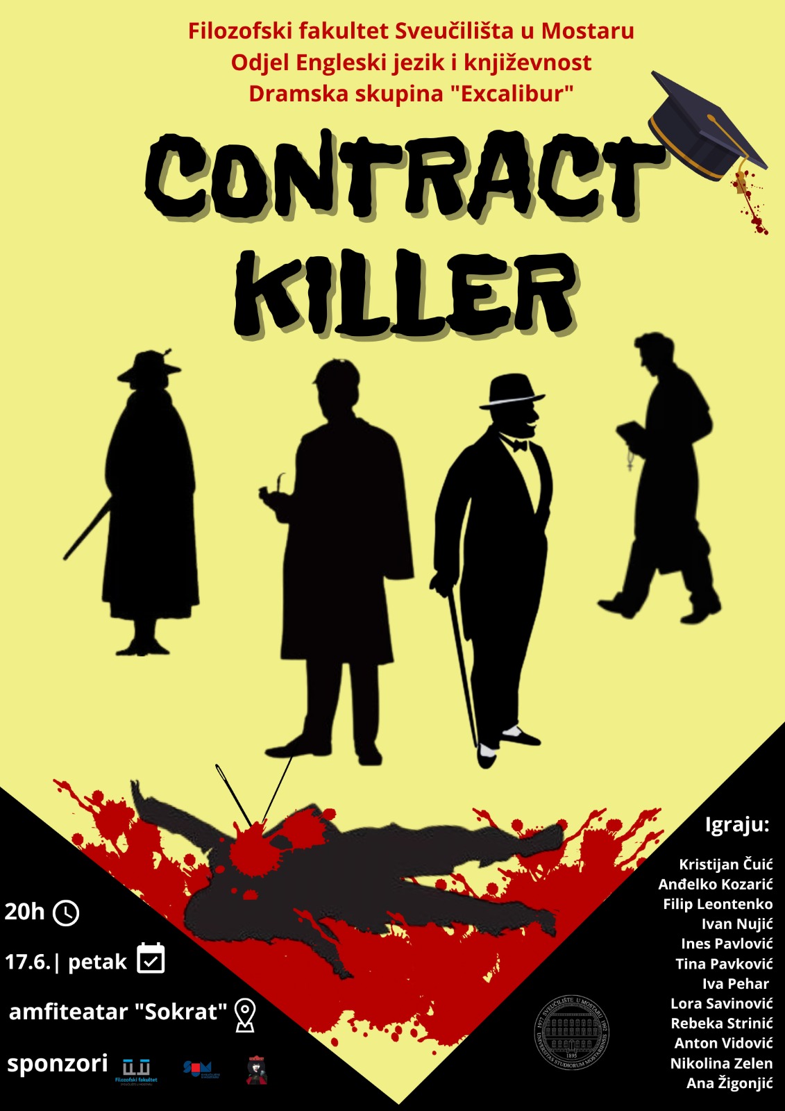 Excalibur, dramska sekcija sa Studija engleskoga jezika i književnosti Filozofskoga fakulteta Sveučilišta u Mostaru, u petak, 17. lipnja 2022., s početkom u 20 sati, premijerno izvodi svoju četvrtu predstavu Contract Killer.