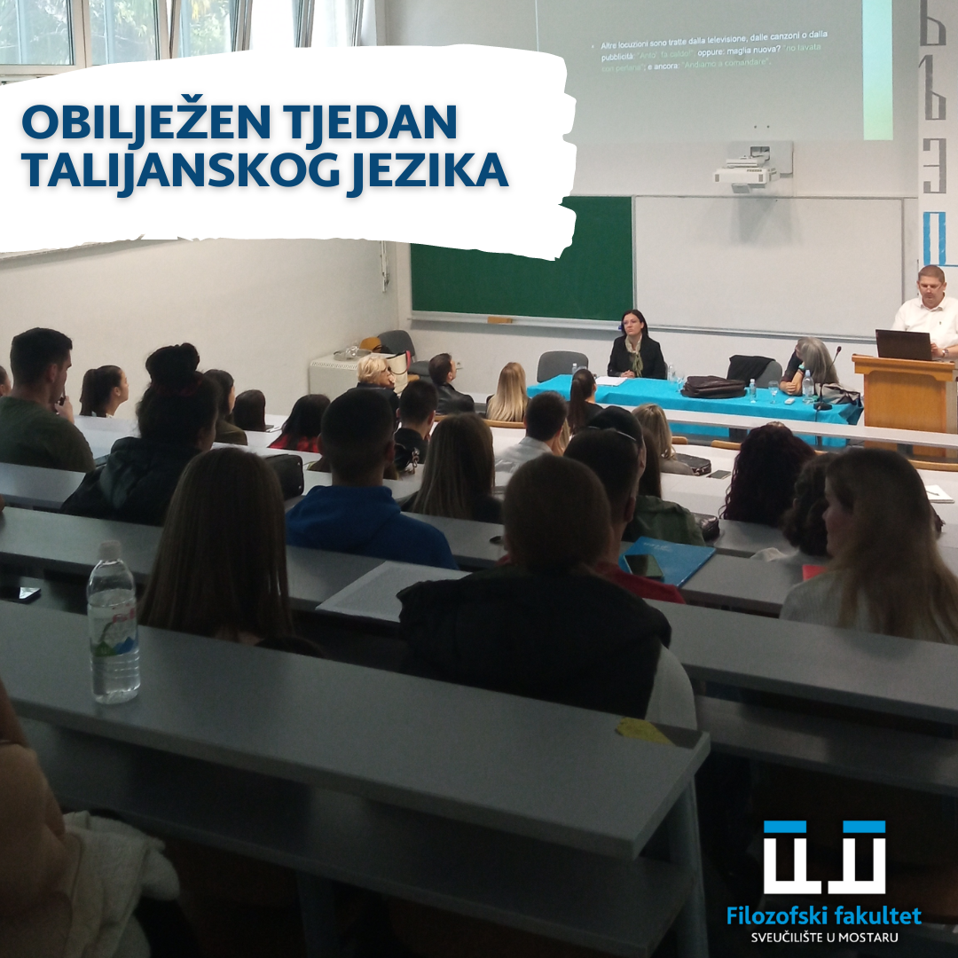 Na Filozofskom fakultetu Sveučilišta u Mostaru obilježen je Tjedan talijanskog jezika u organizaciji Studija talijanskog jezika i književnosti, a tema ovogodišnjega izlaganja bila je "Talijanski i mladi“.
