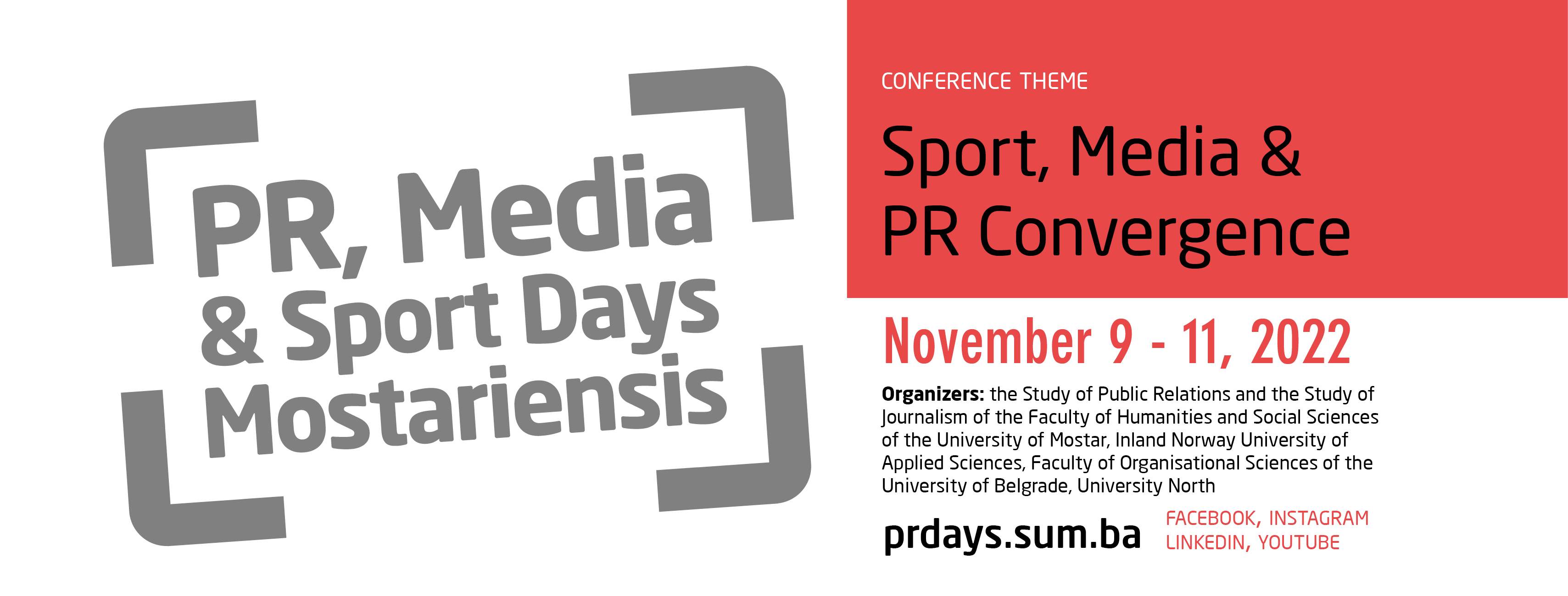 Sedma Međunarodna znanstveno-stručna konferencija PR, Media & Sport Days Mostariensis s područja odnosa s javnošću, integrirane komunikacije i medija održat će se 9., 10. i 11. studenoga s izravnim TV prijenosom Televizije Sveučilišta u Mostaru. Osim domaćih organizatora Konferencije, Studija odnosa s javnošću i Studija novinarstva Filozofskoga fakulteta Sveučilišta u Mostaru, ovogodišnji međunarodni suorganizatori su Fakultet za audiovizualne medije i kreativne tehnologije Sveučilišta primijenjenih znanosti Inland Norveška, Sveučilište Sjever iz Republike Hrvatske i Fakultet organizacionih nauka Univerzitet Beograd.