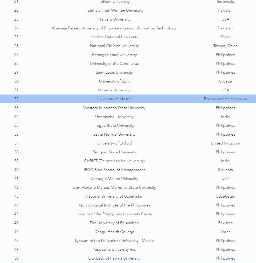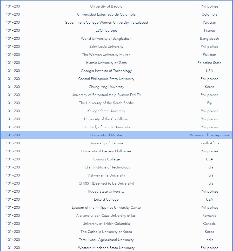 Sveučilište u Mostaru je jedino sveučilište iz Bosne i Hercegovine na navedenoj ljestvici, a iz regije je tu Sveučilište u Splitu. Sveučilišta su rangirana u šest kategorija: industrijska primjena, poduzetnički duh, društvena odgovornost, etika i integritet, studentska mobilnost, krizni menadžment i četvrta industrijska revolucija.