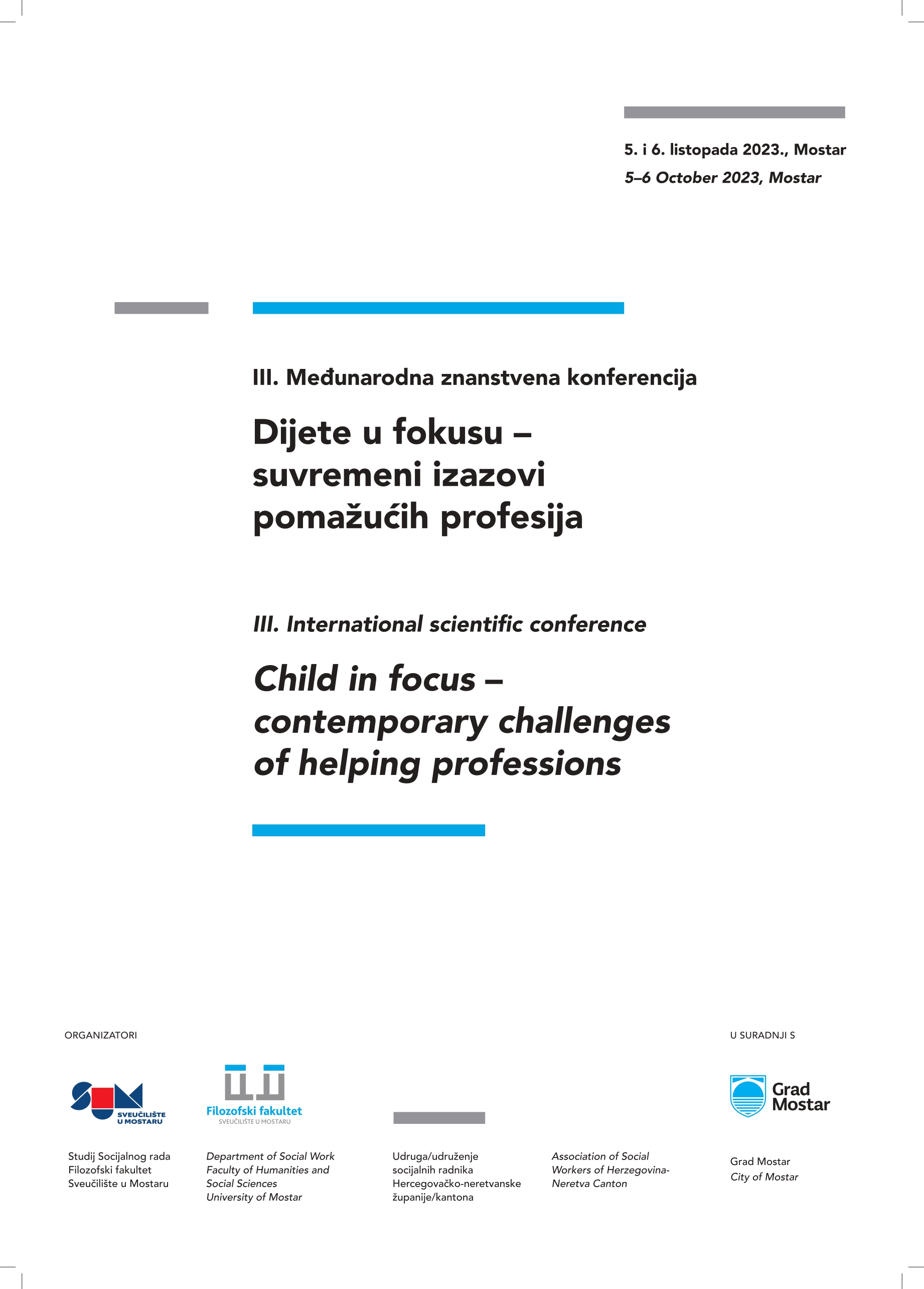Na Filozofskom fakultetu Sveučilišta u Mostaru održat će se III. Međunarodna znanstvena konferencija Dijete u fokusu – suvremeni izazovi pomažućih profesija 5. i 6. listopada 2023. godine koju organizira studij Socijalnog rada Filozofskog fakulteta SUM-a u suradnji s Udrugom socijalnih radnika Hercegovačko-neretvanske županije.