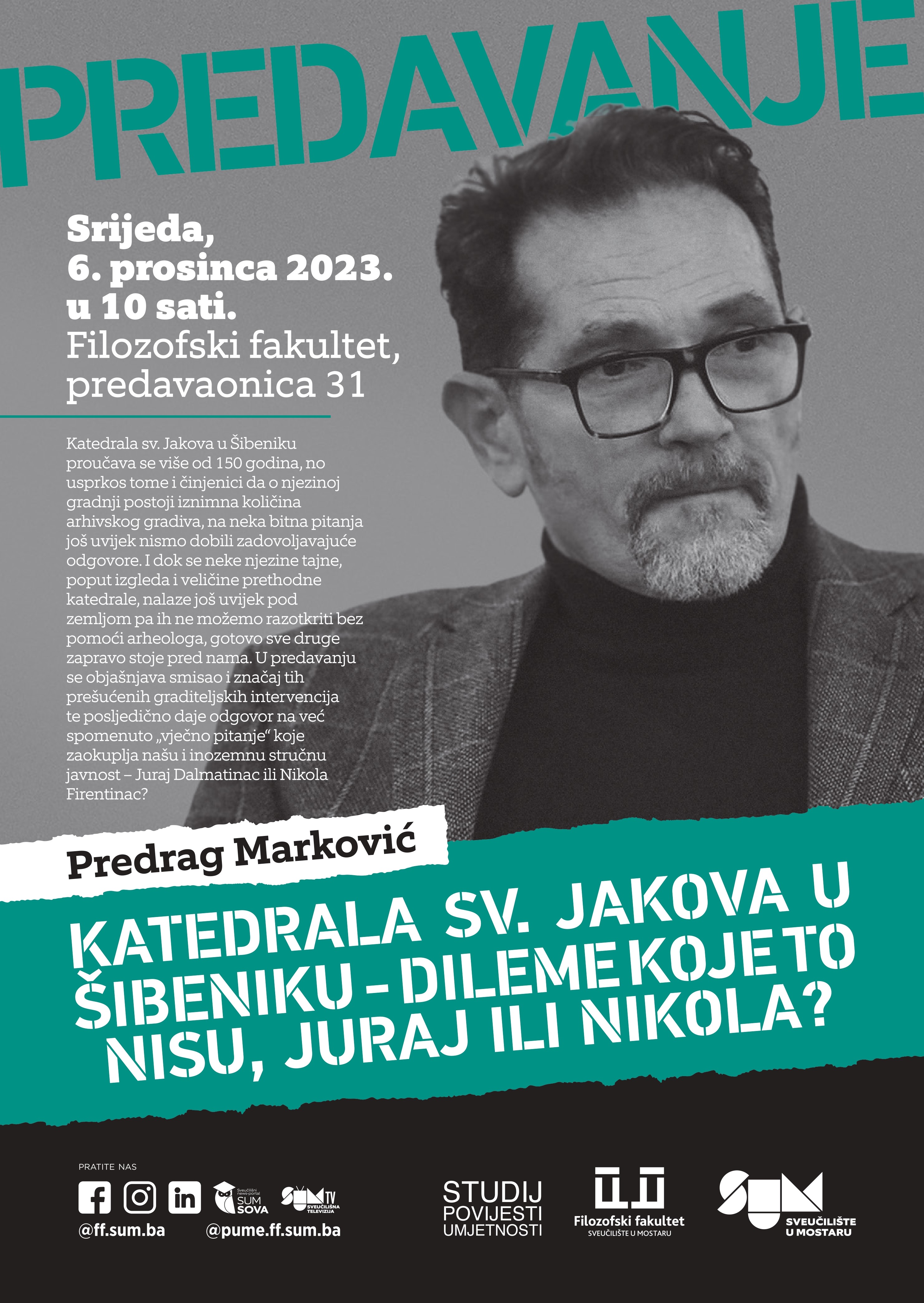 Na Filozofskom fakultetu Sveučilišta u Mostaru prof. dr. sc. Predrag Marković održat će predavanje na temu "Katedrala sv. Jakova u Šibeniku – dileme koje to nisu, Juraj ili Nikola?" u srijedu, 6. prosinca u 10.00 sati u učionici 31. Predavanje organizira studij Povijesti umjetnosti Filozofskog fakulteta.
