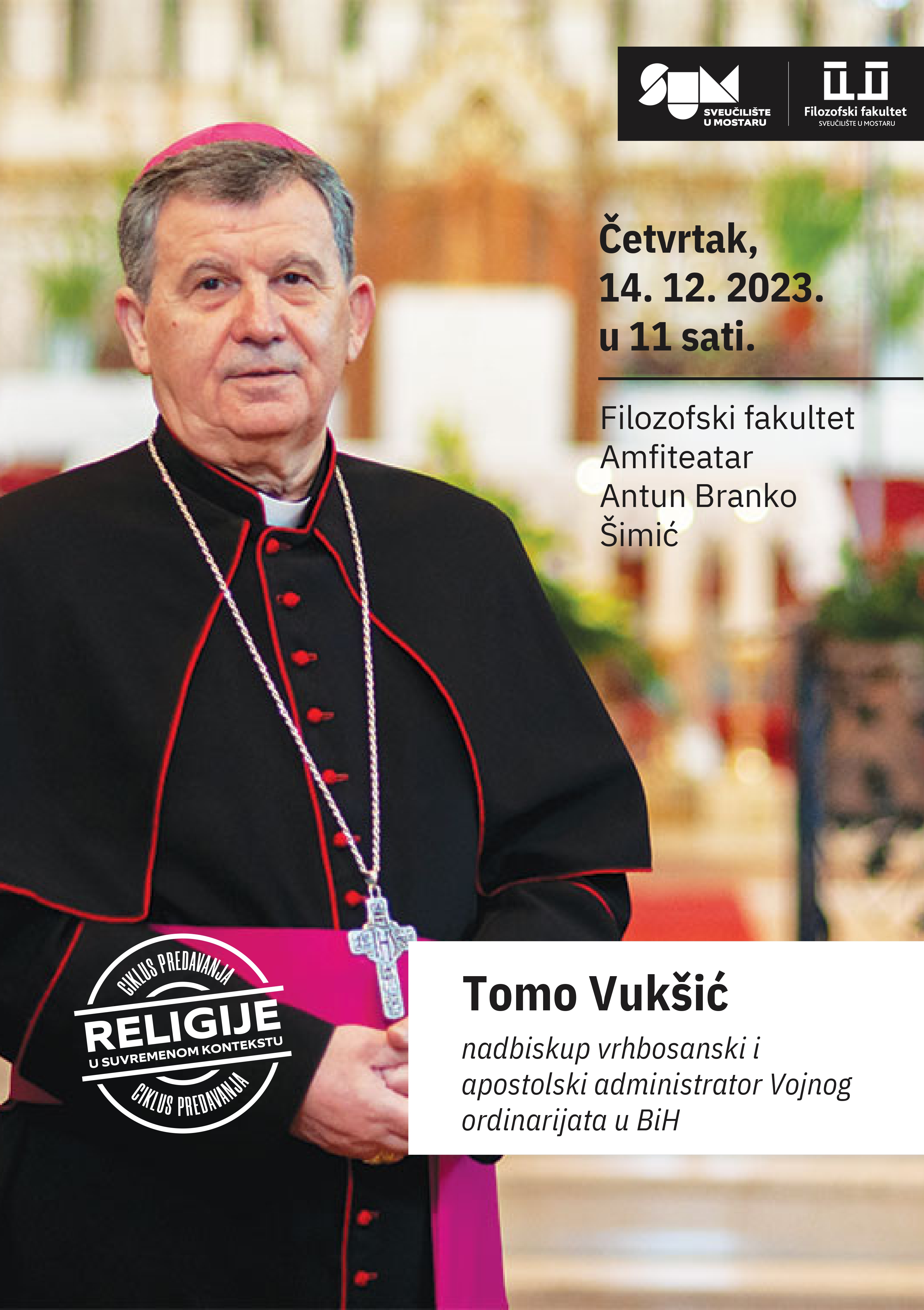 Mons. dr. Tomo Vukšić, nadbiskup metropolit vrhbosanski i apostolski upravitelj Vojnog ordinarijata u Bosni i Hercegovini održat će predavanje na Filozofskom fakultetu Sveučilišta u Mostaru 14. prosinca (četvrtak) u amfiteatru Antun Branko Šimić u 11.00 sati.